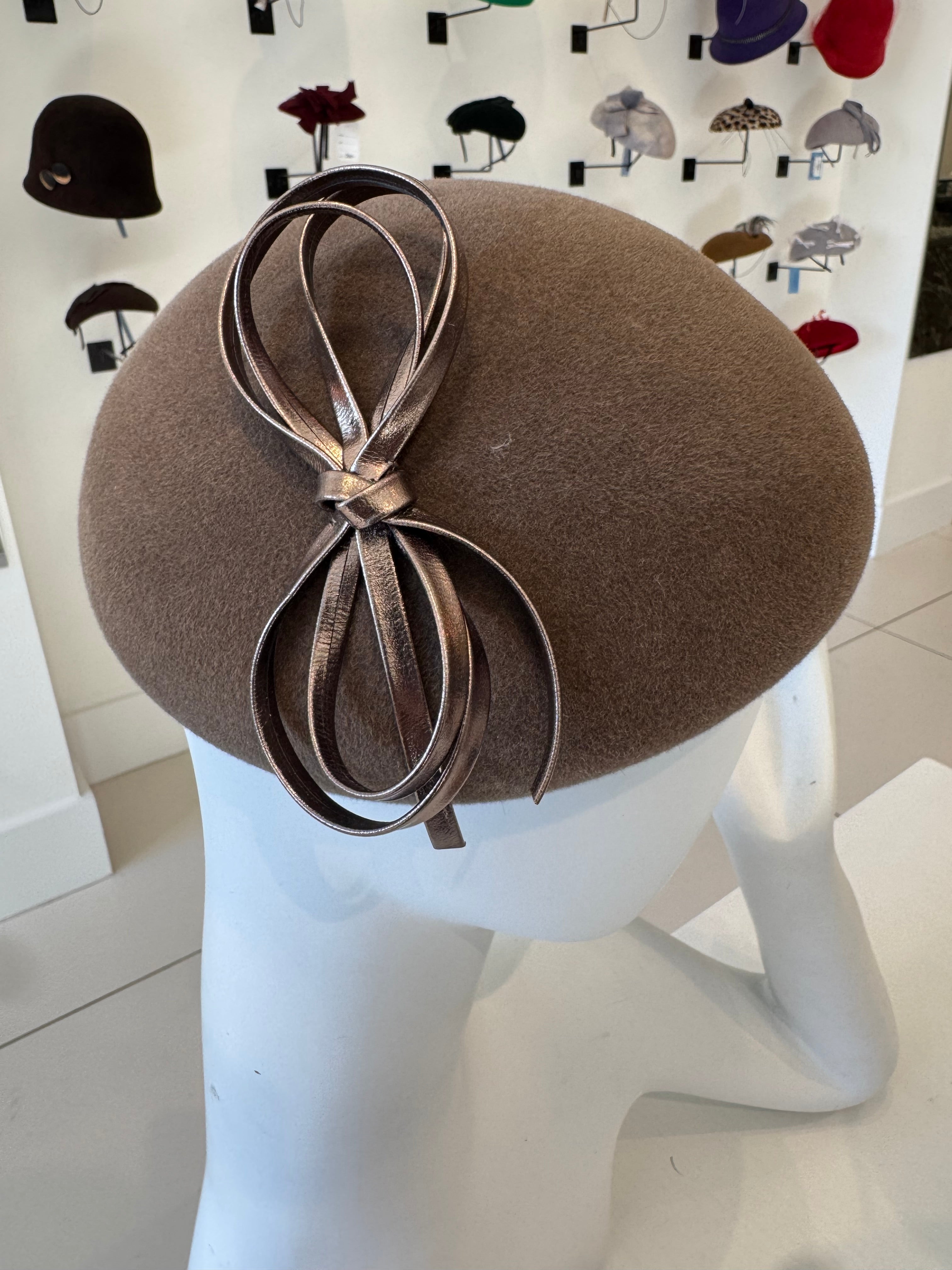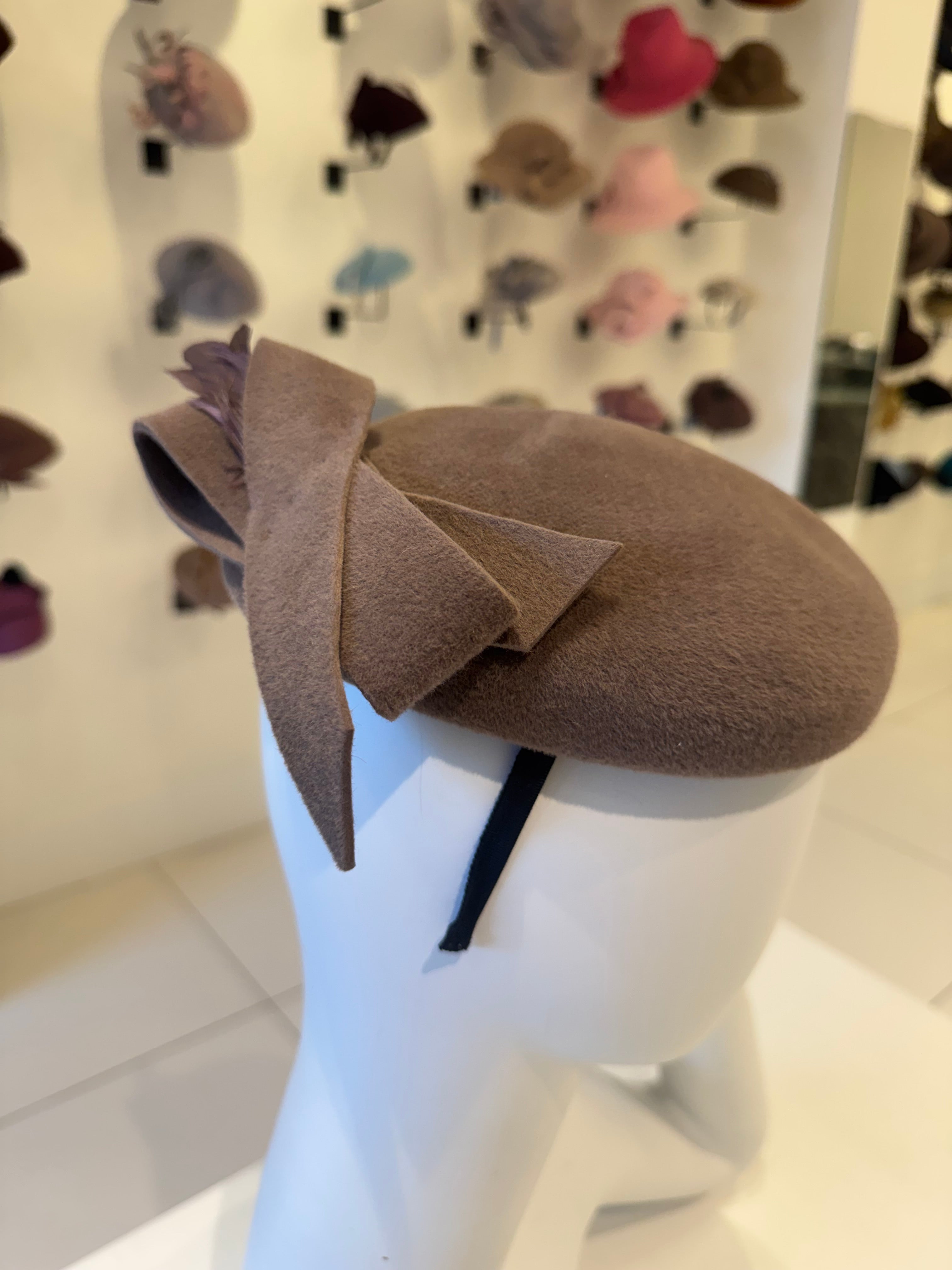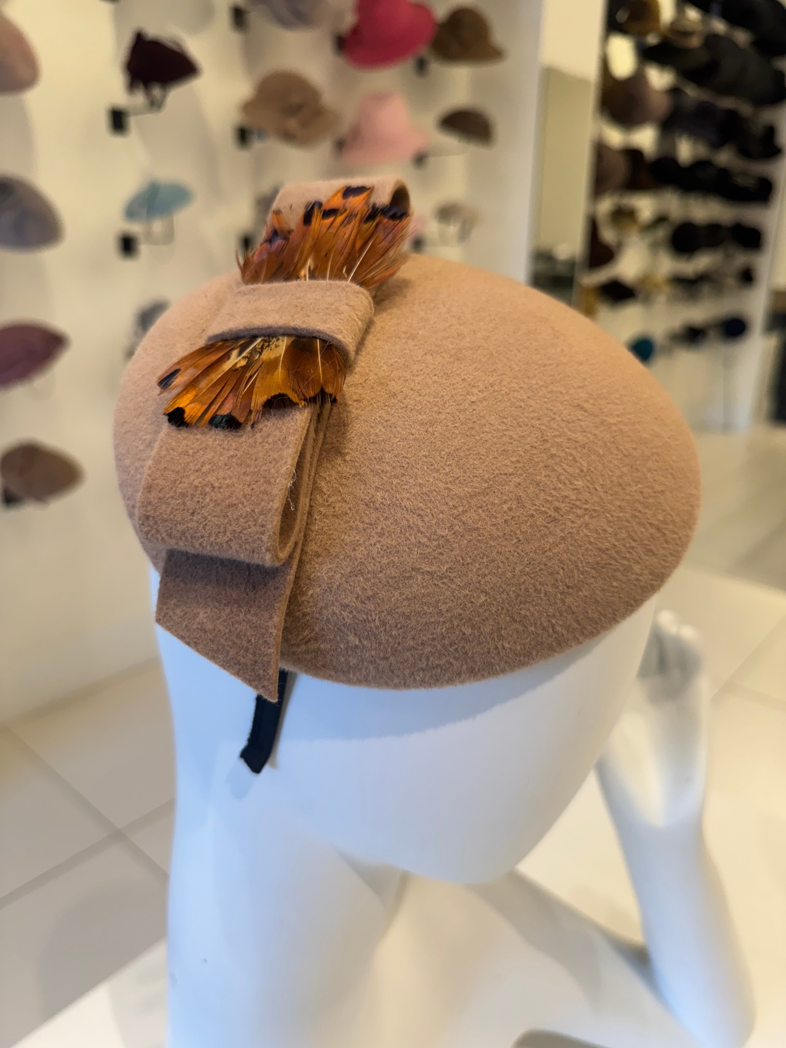 Camel Velour Fascinator With Bow & Feather Trim Detail.