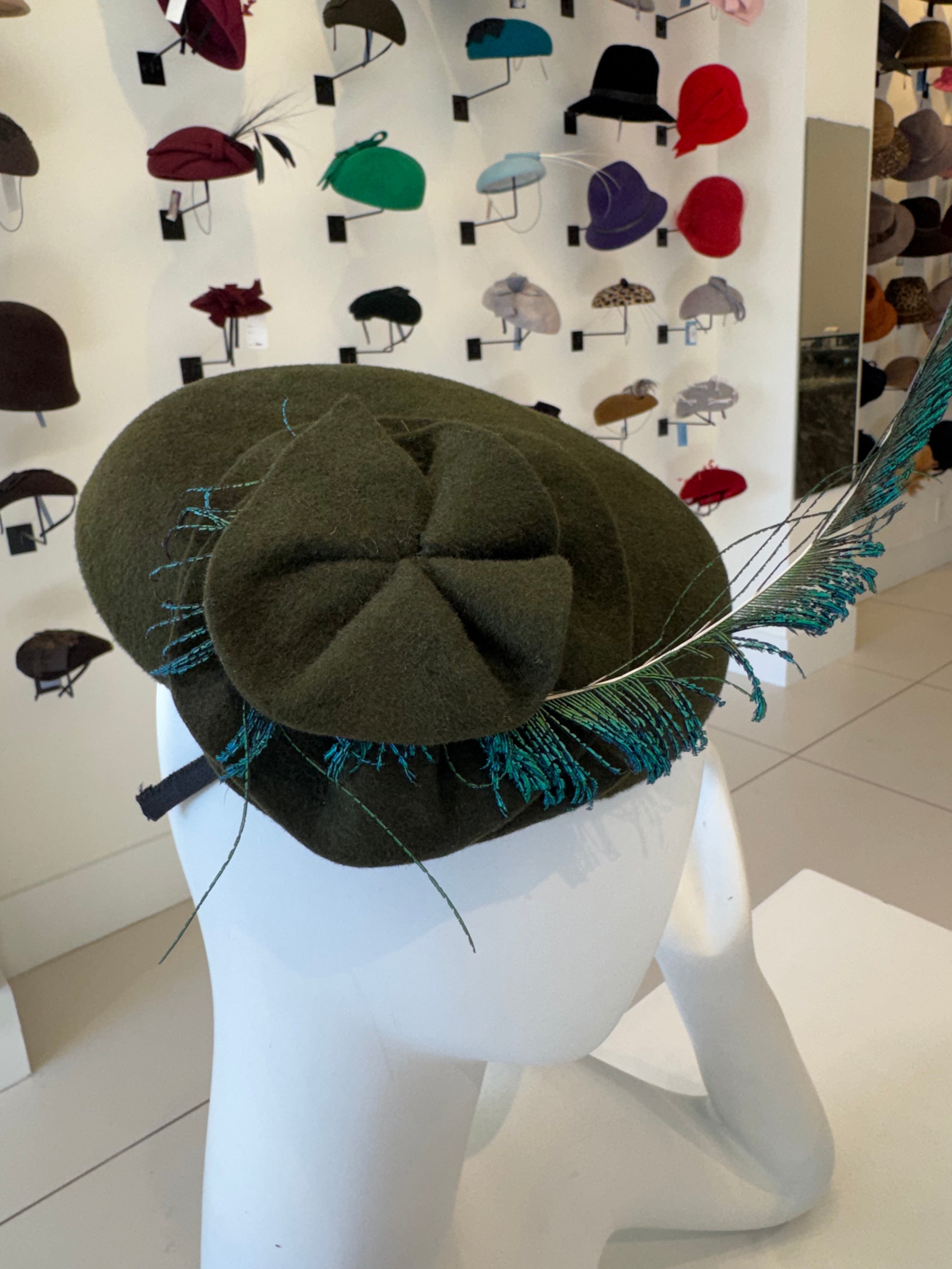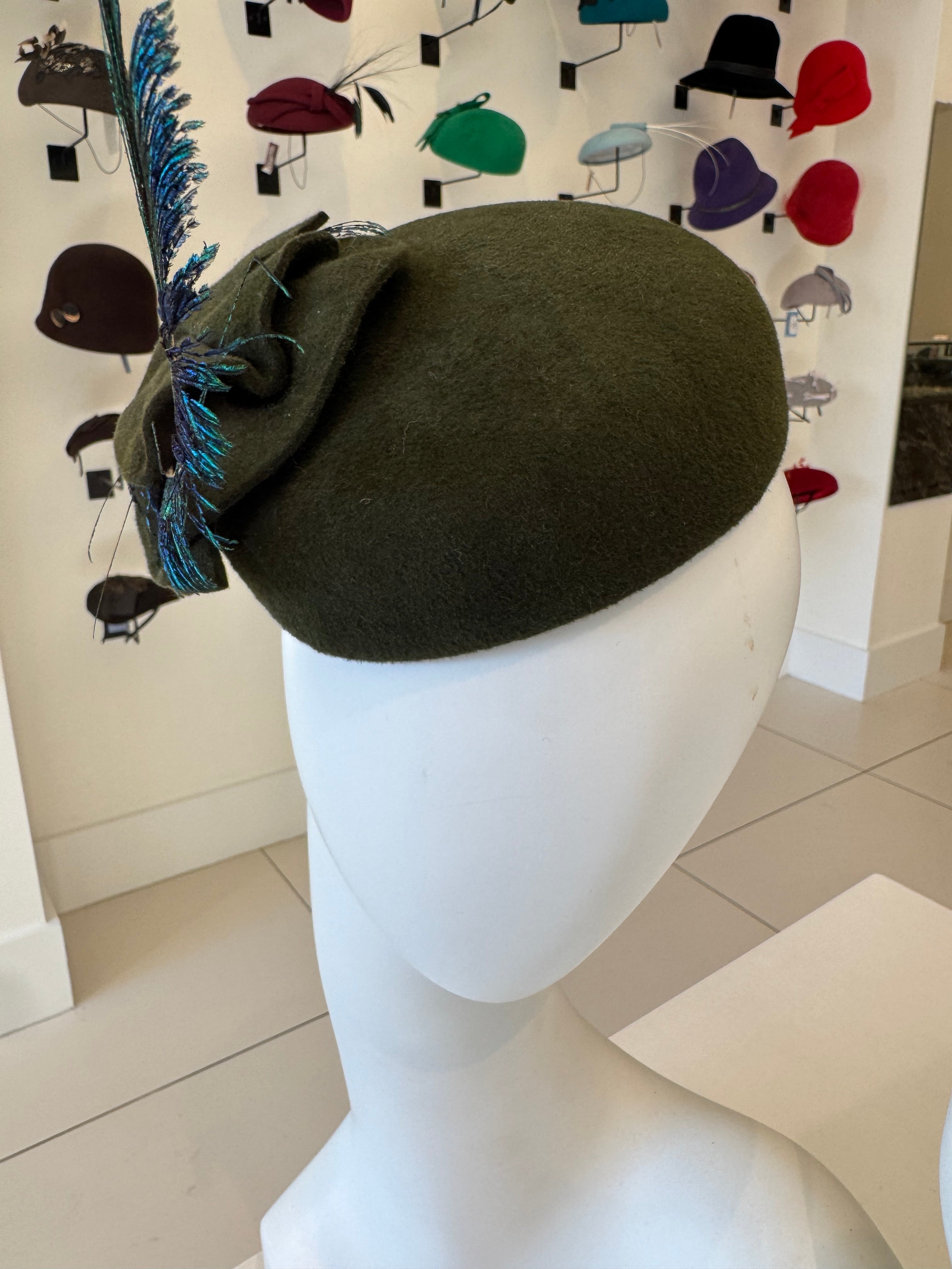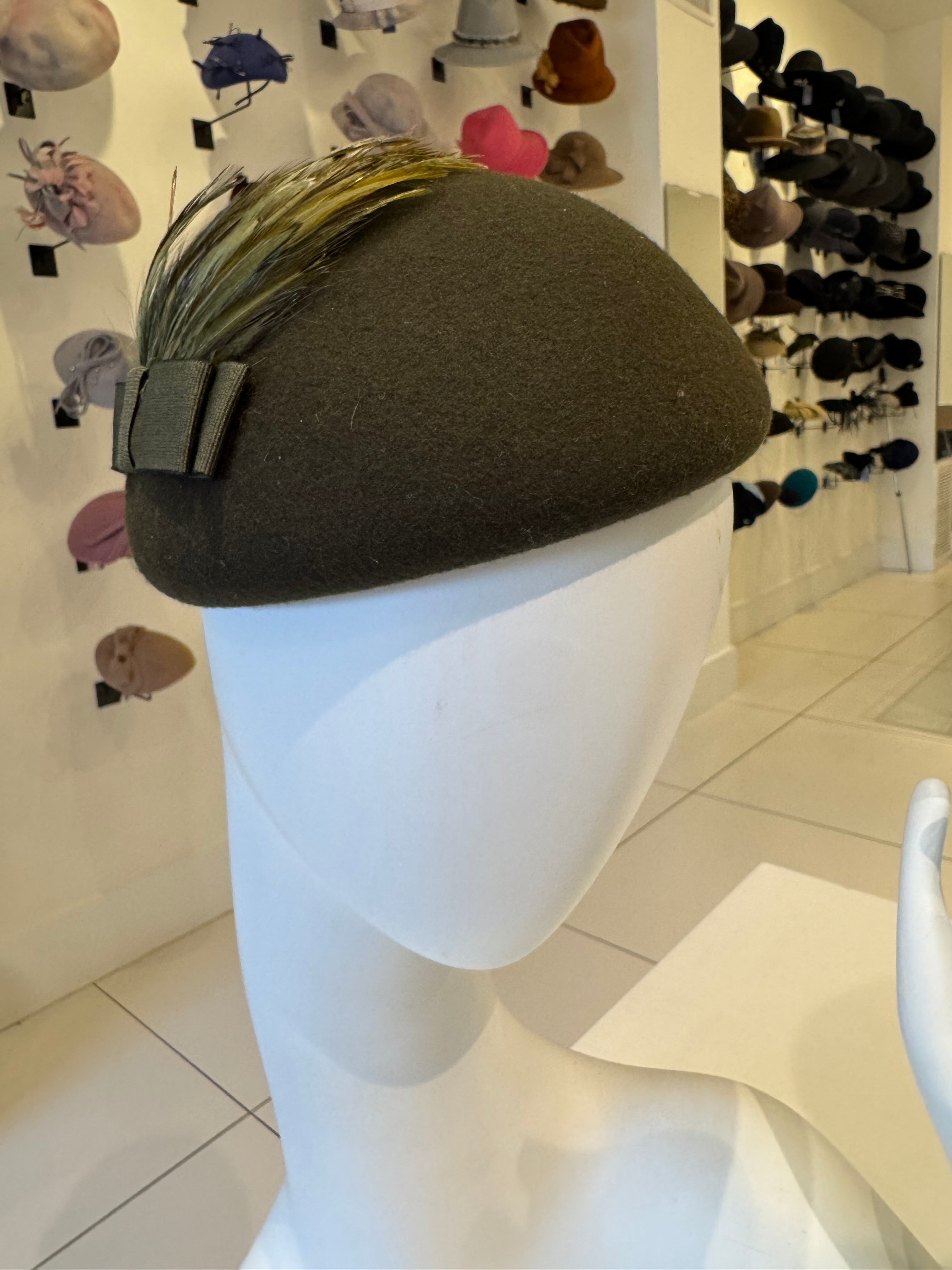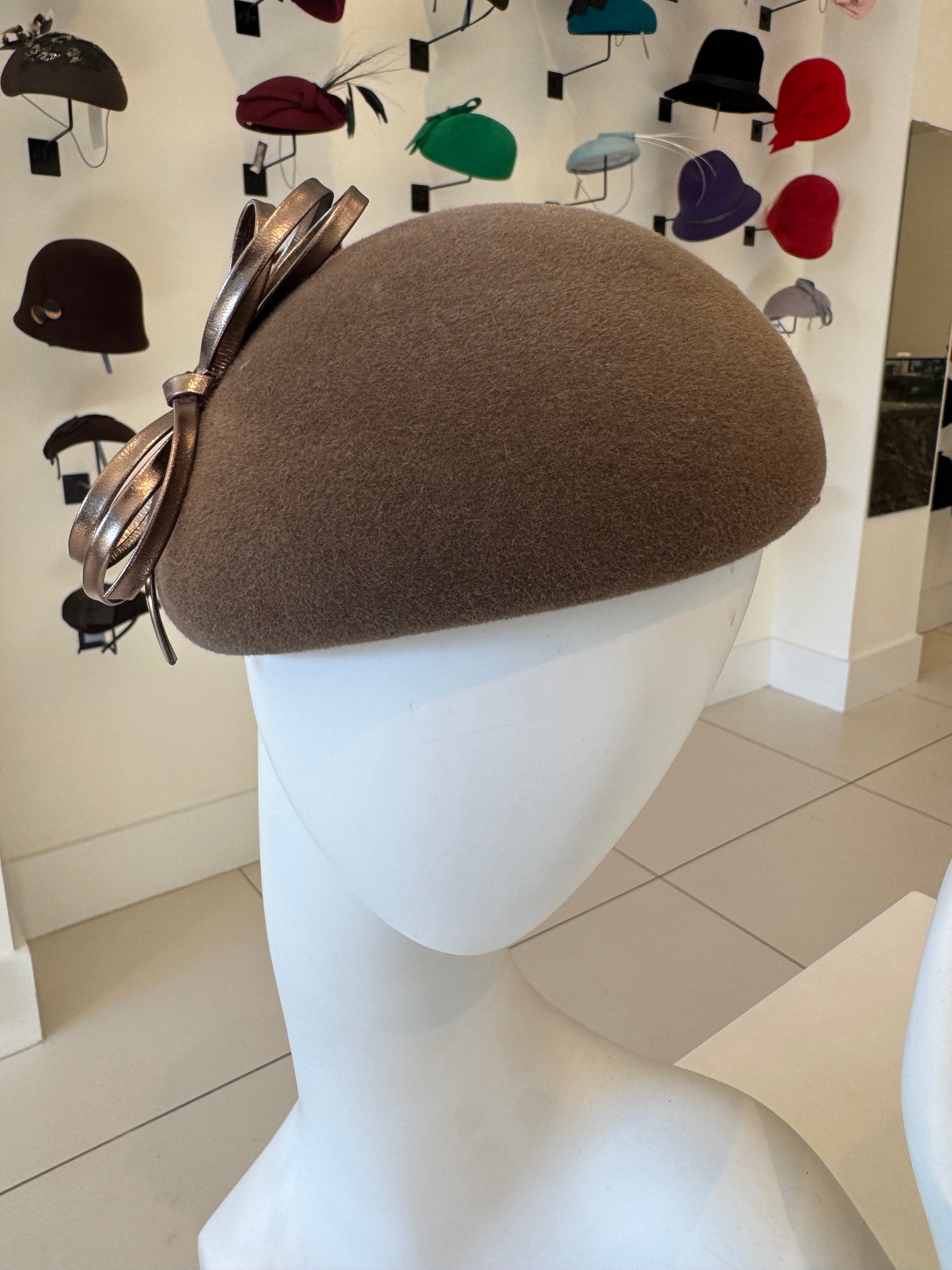 Camel Velour Fascinator With Bow & Feather Trim Detail.
