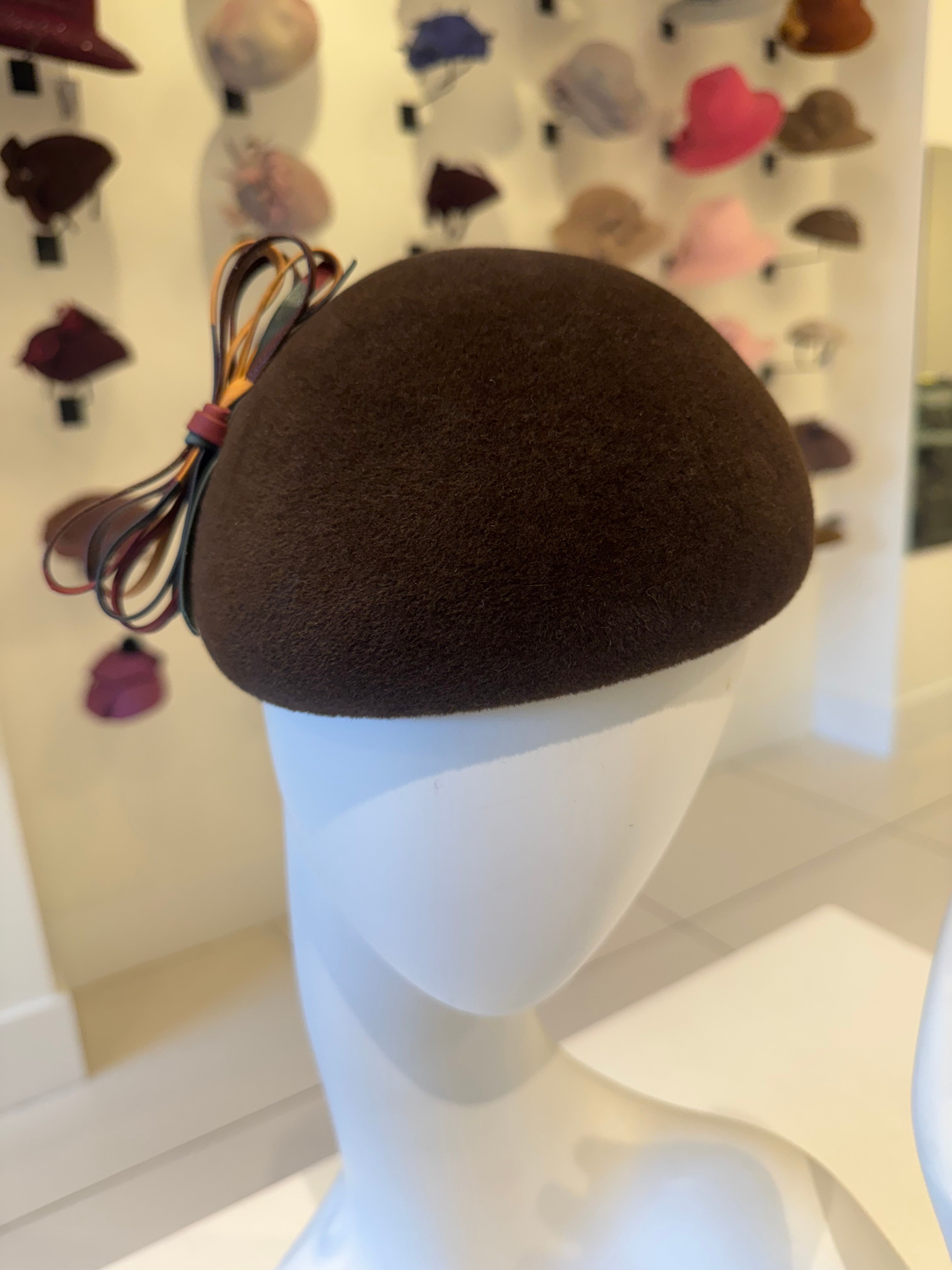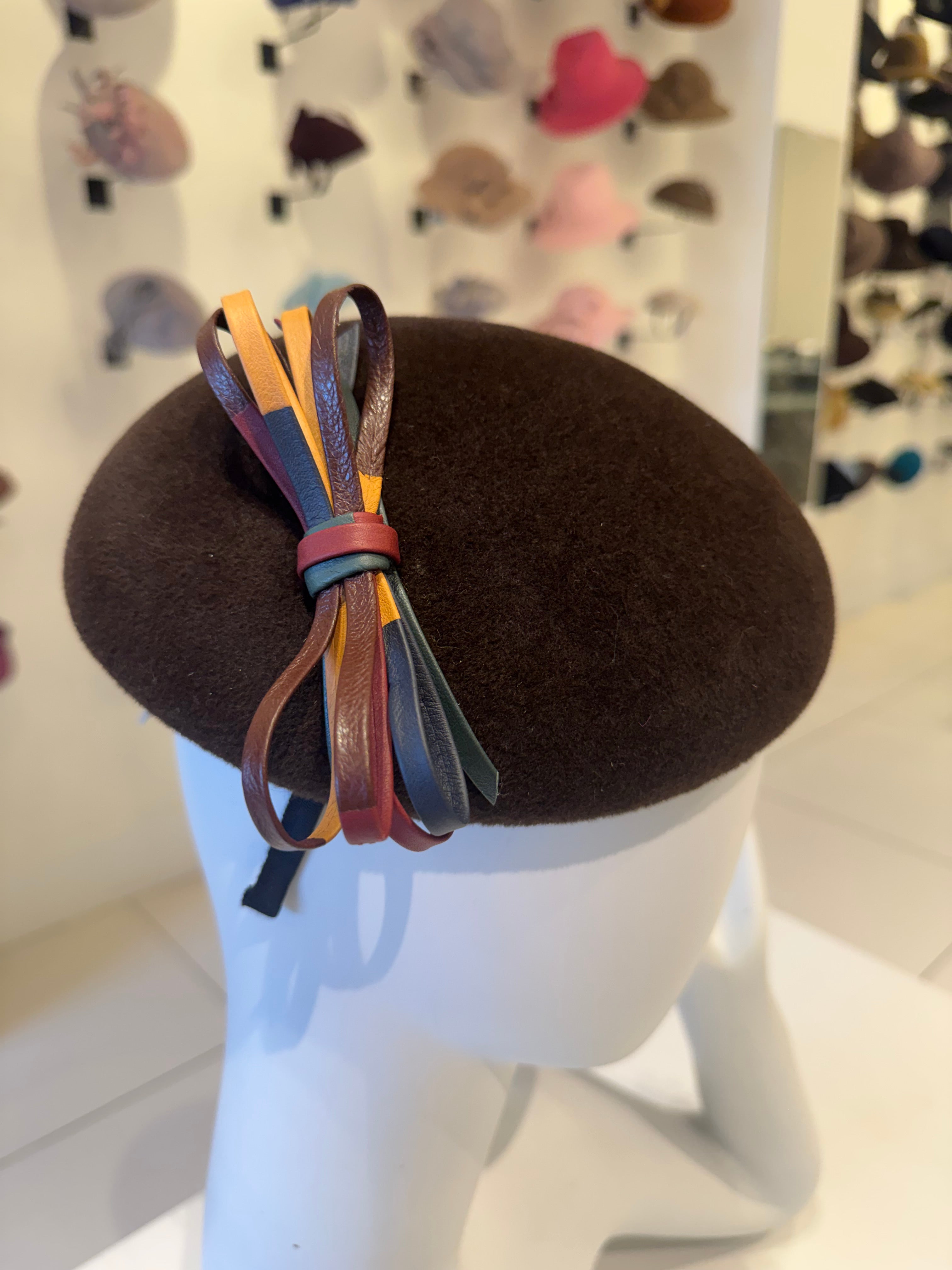 Dark Brown Velour Fascinator With Multicolor Leather Ribbon