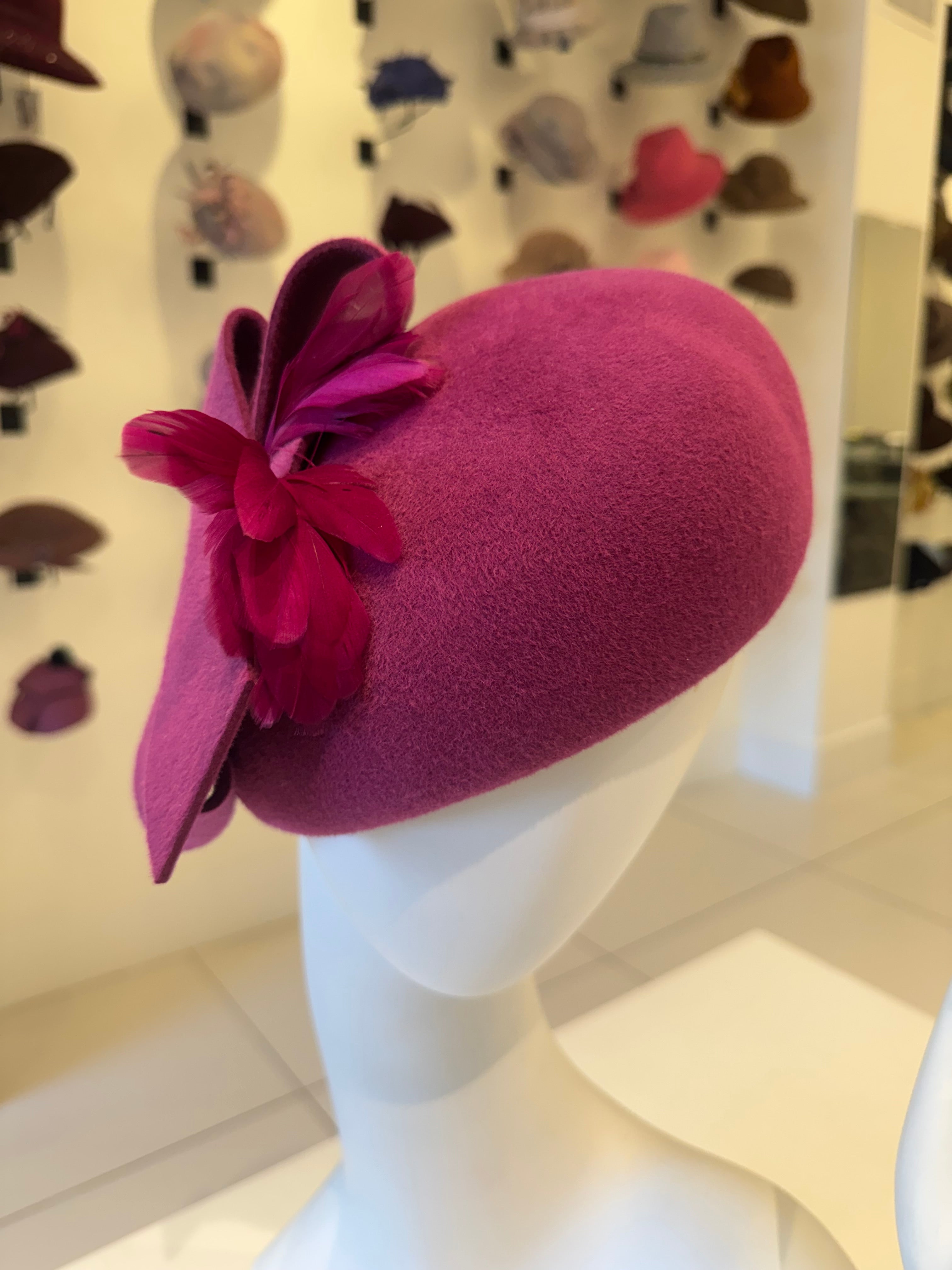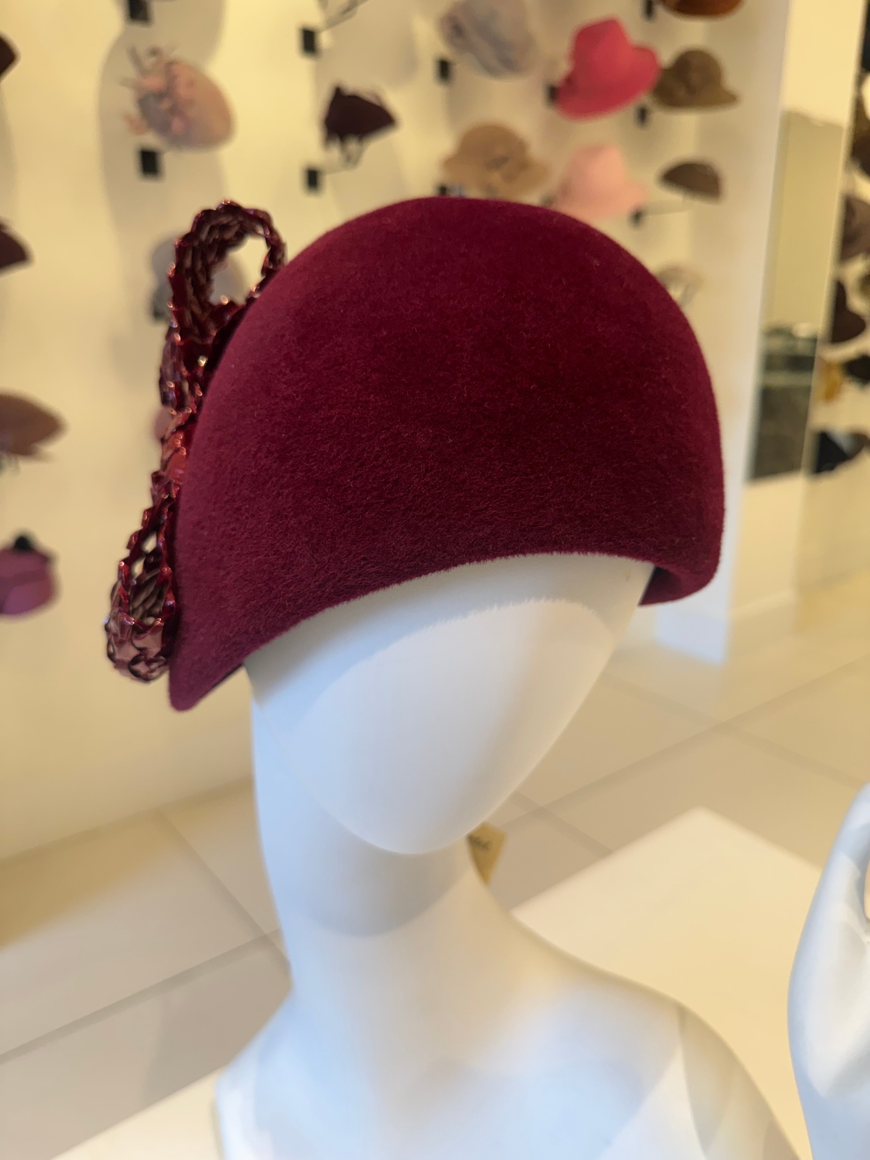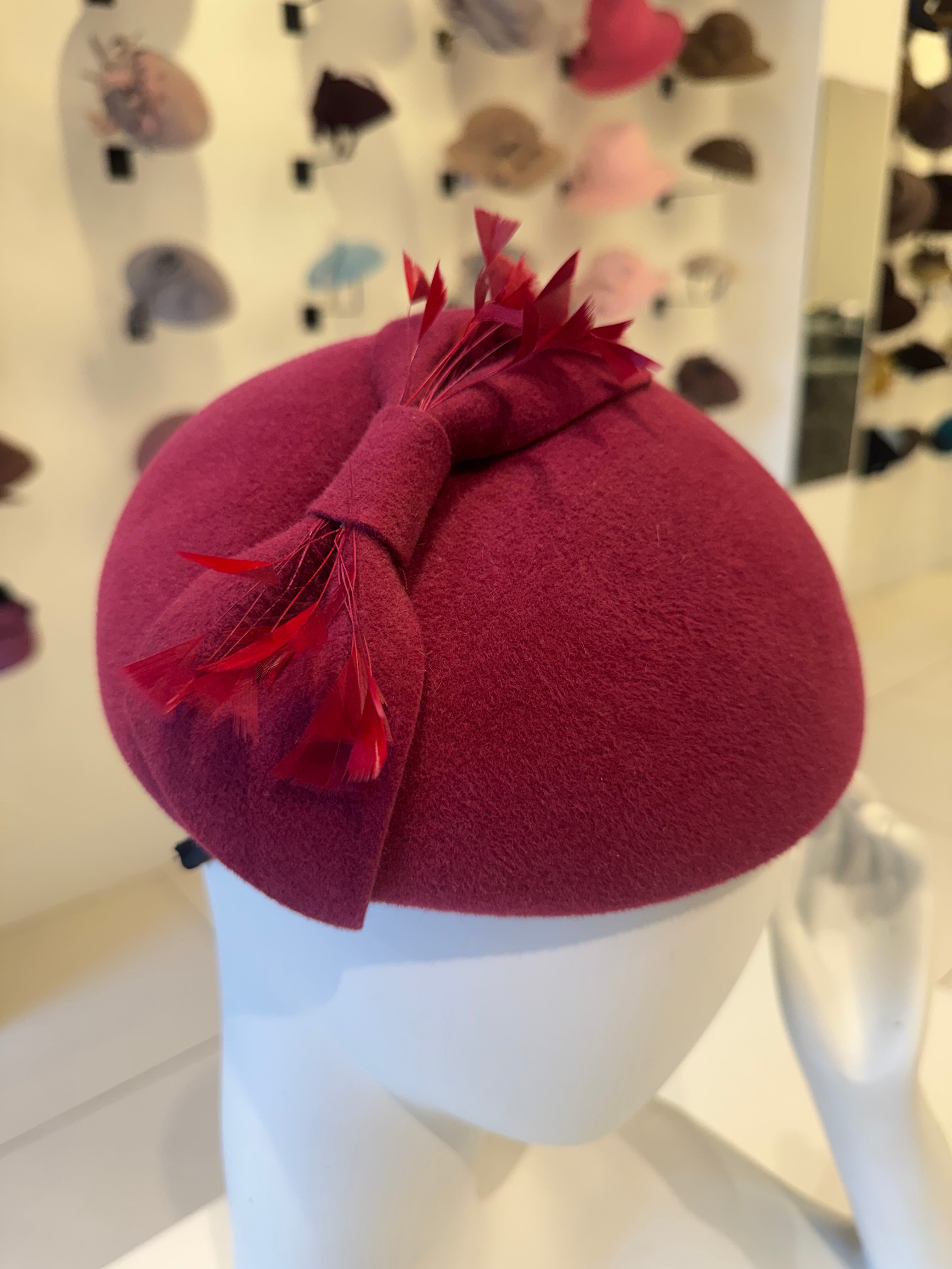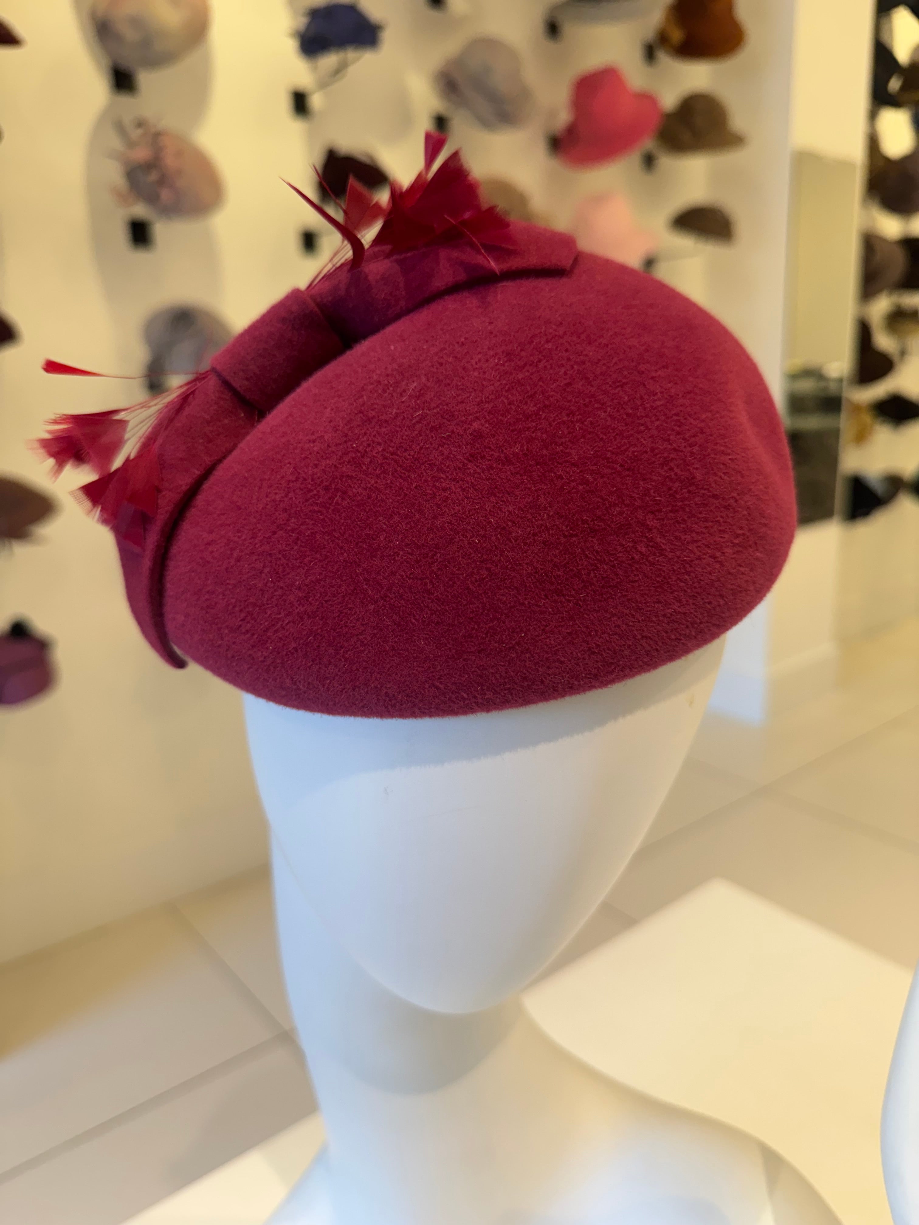 Wine Red Velour Fascinator with Bow & Feather Detail
