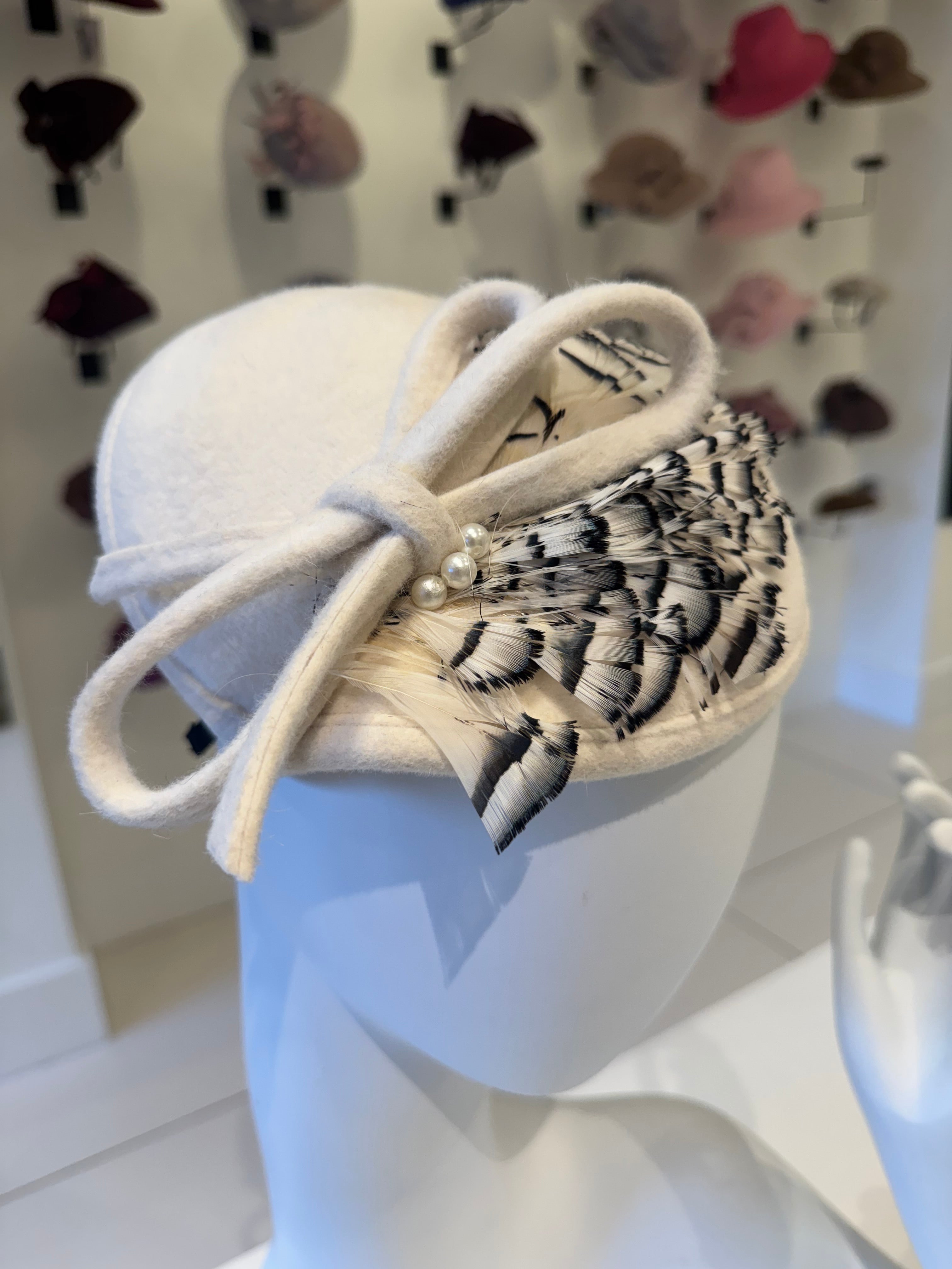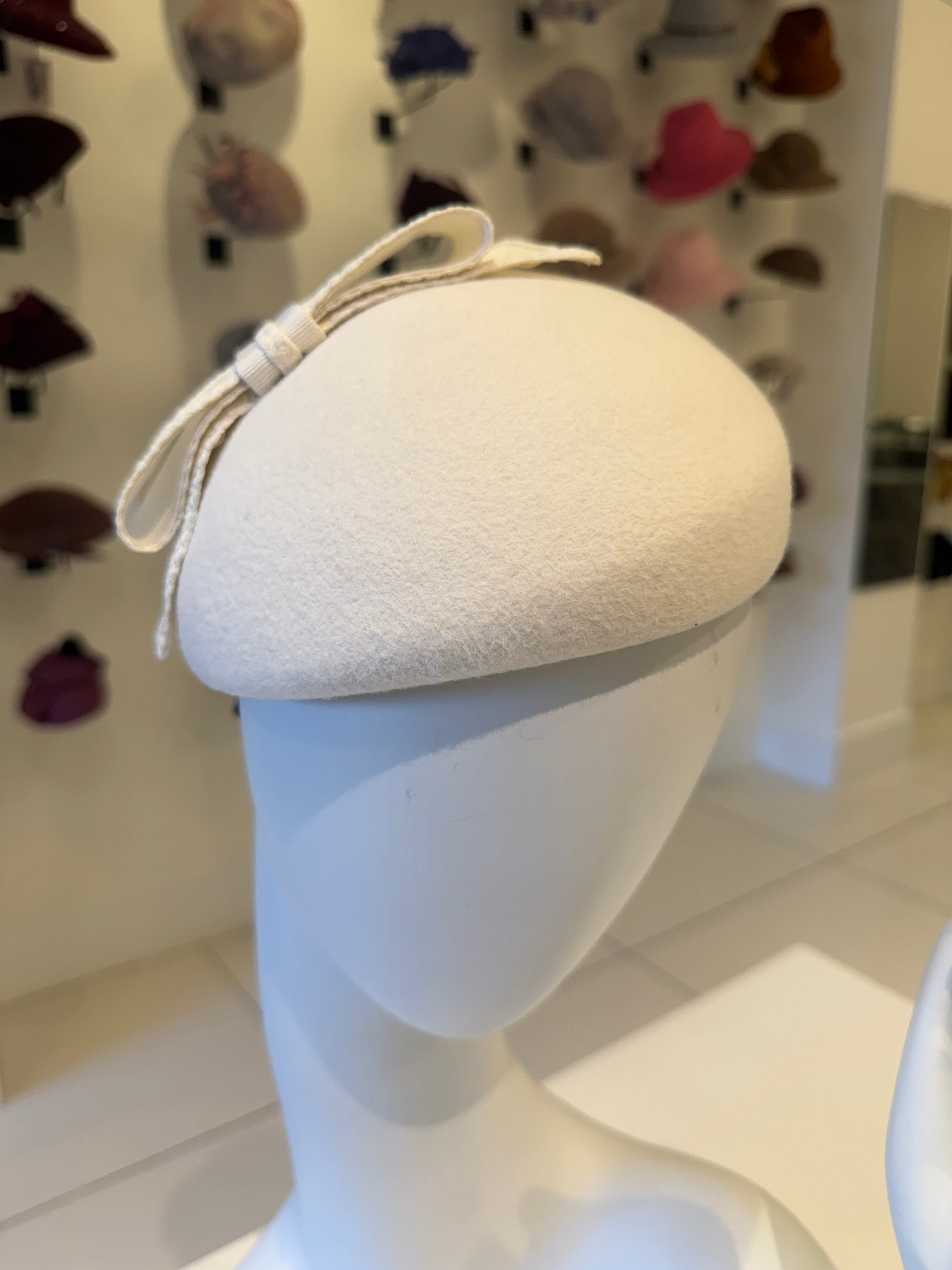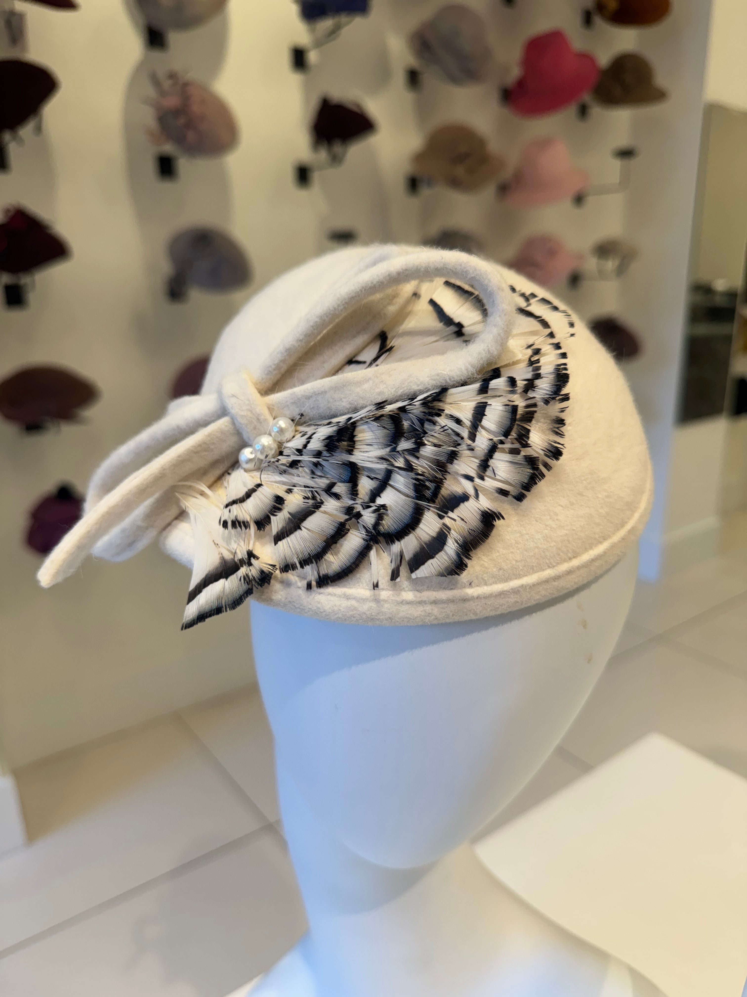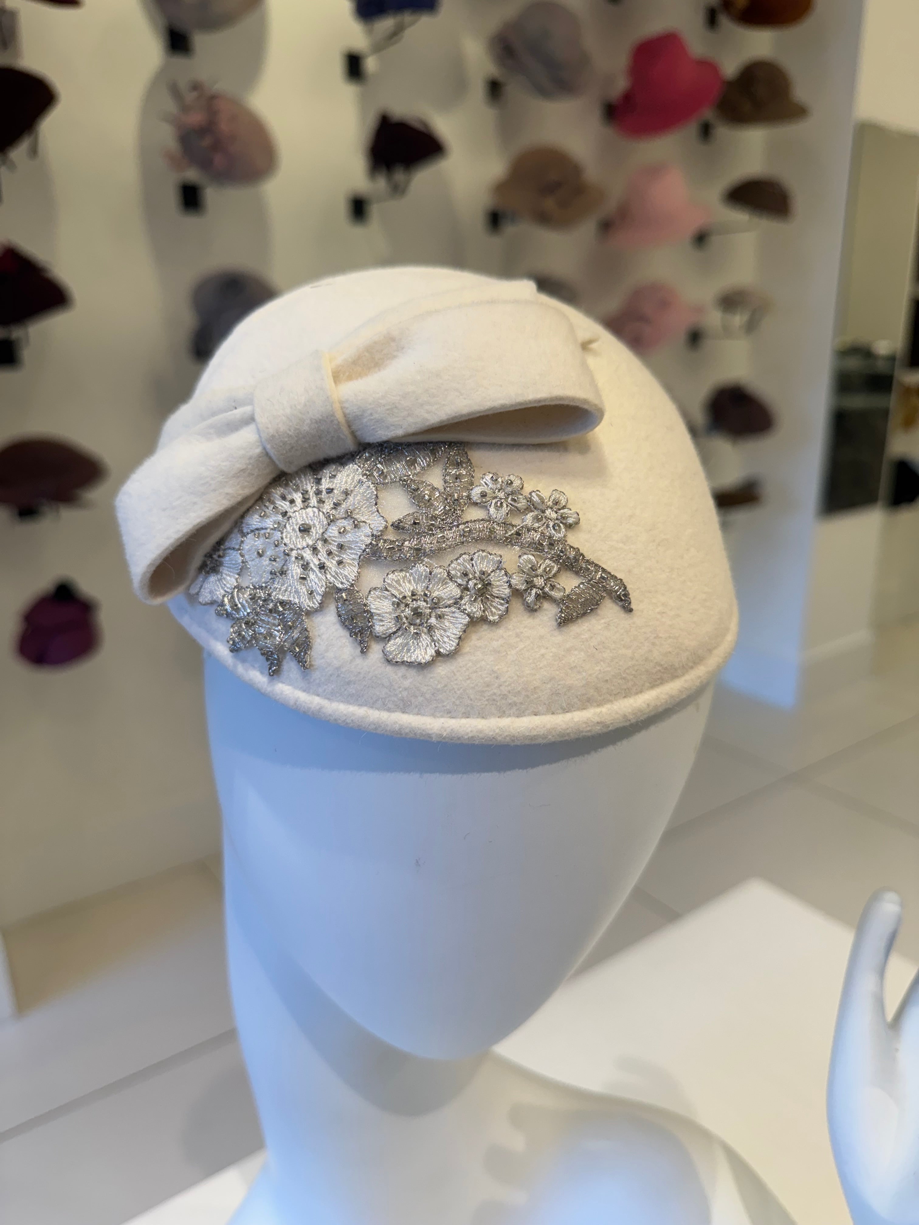 Cream Velour Fascinator with Bow & Beaded Floral Detail