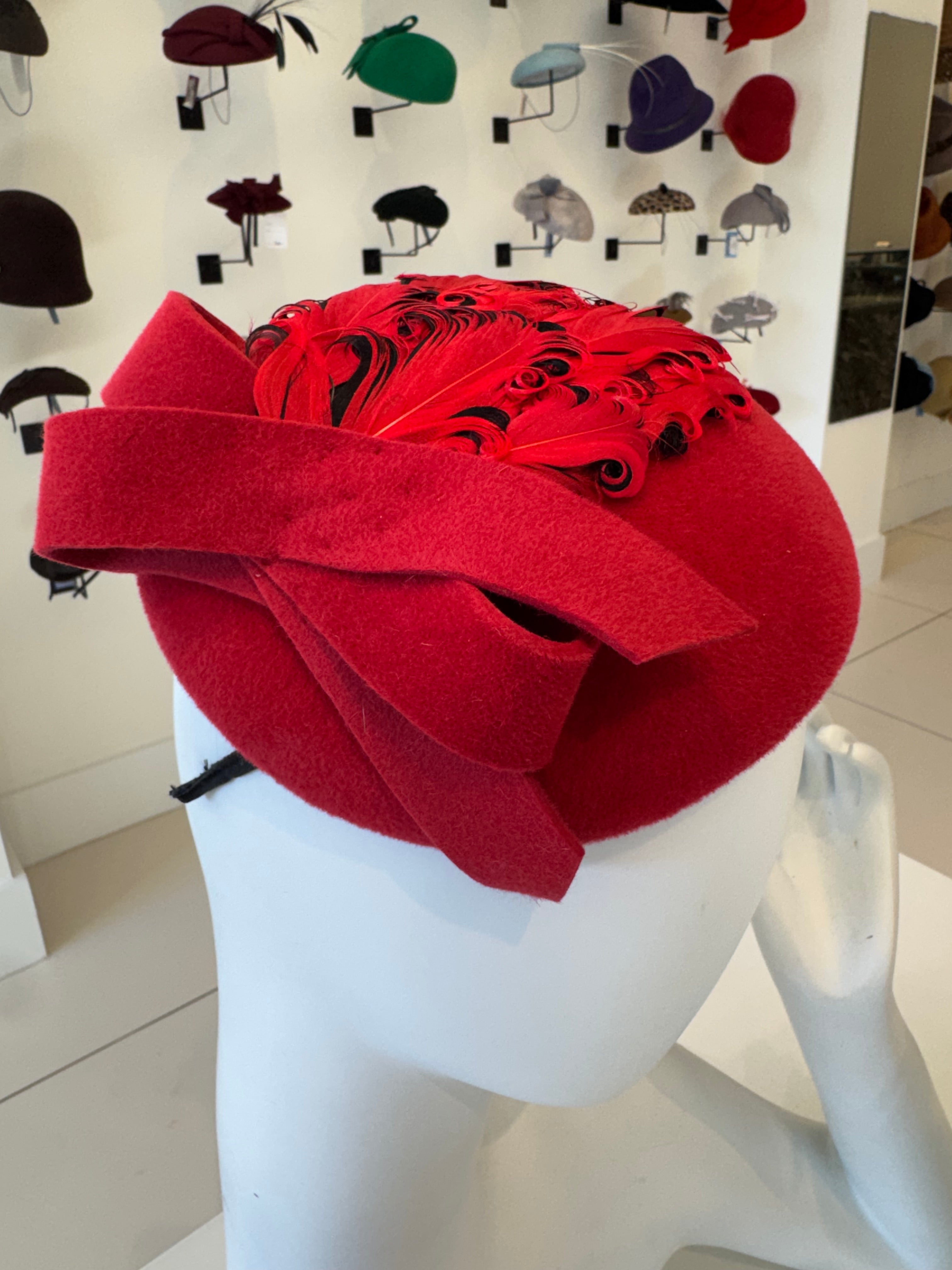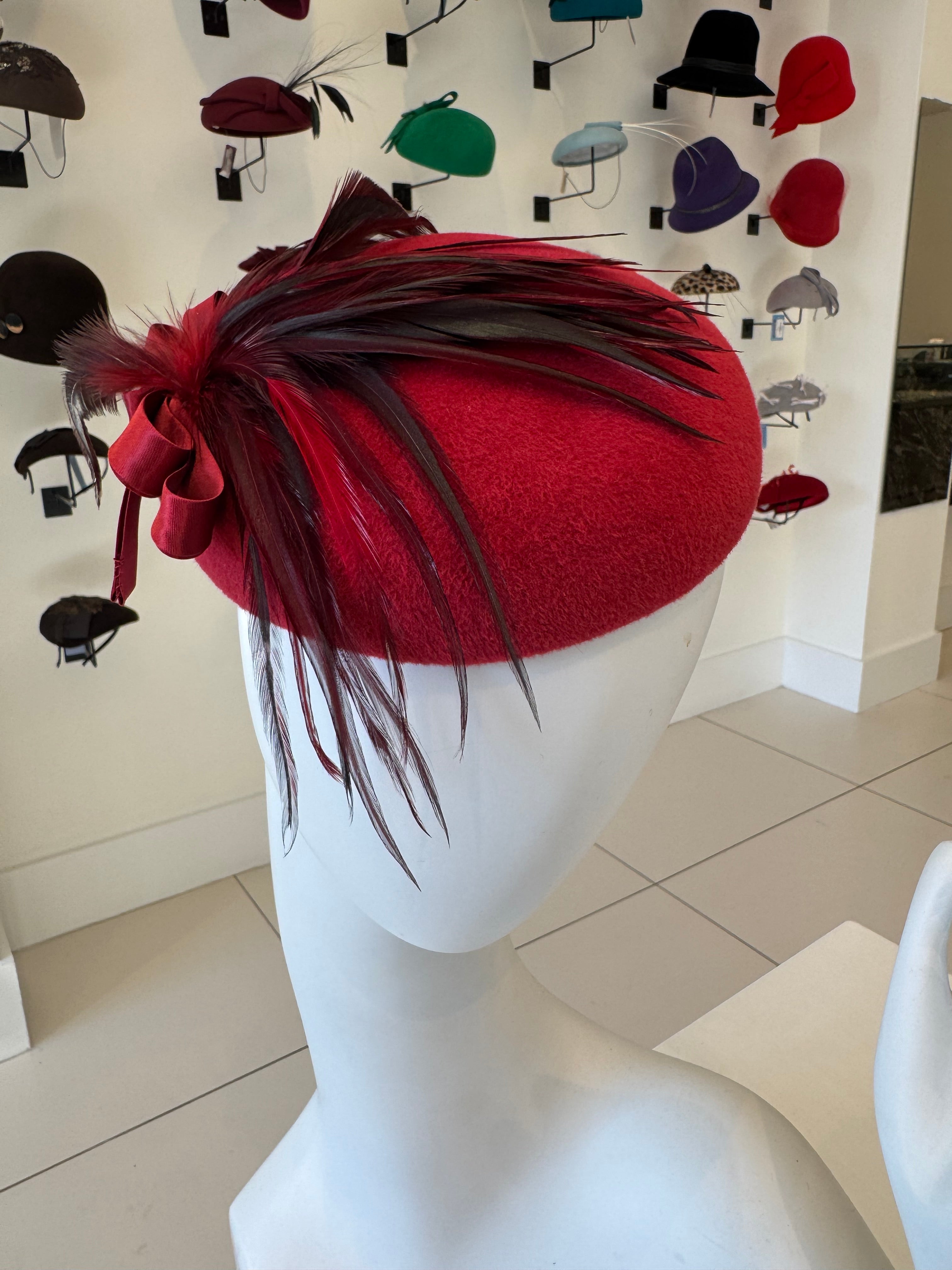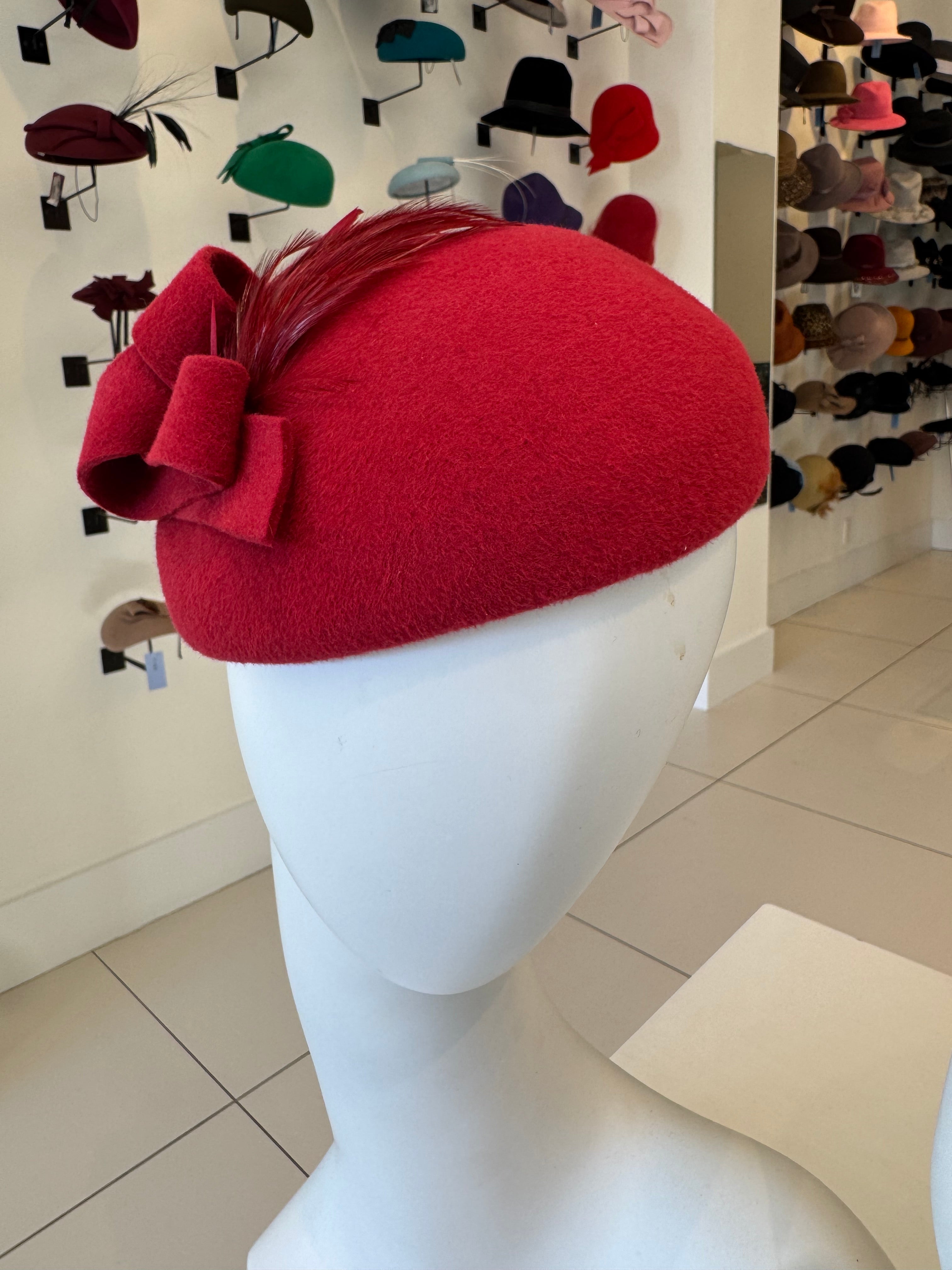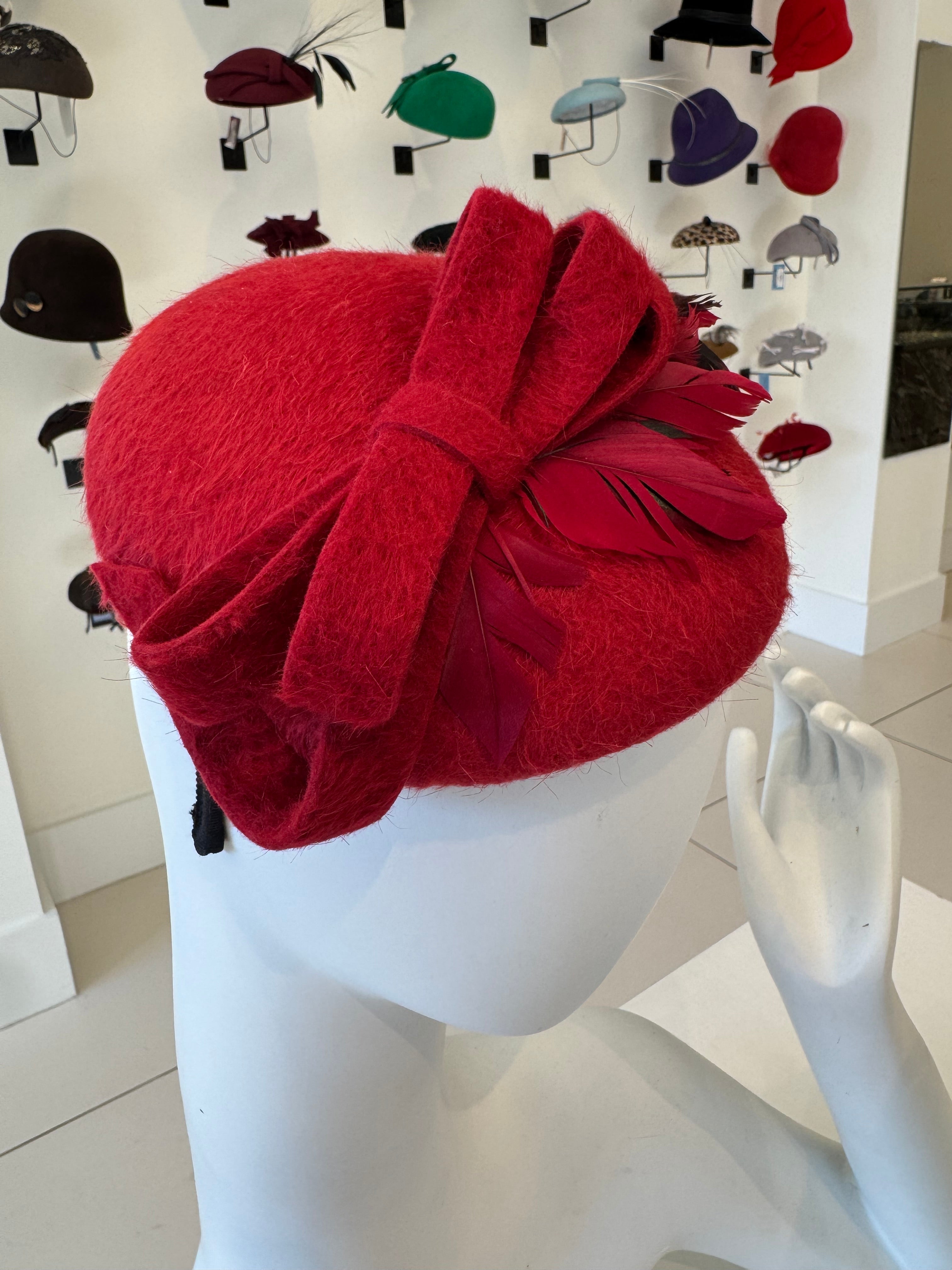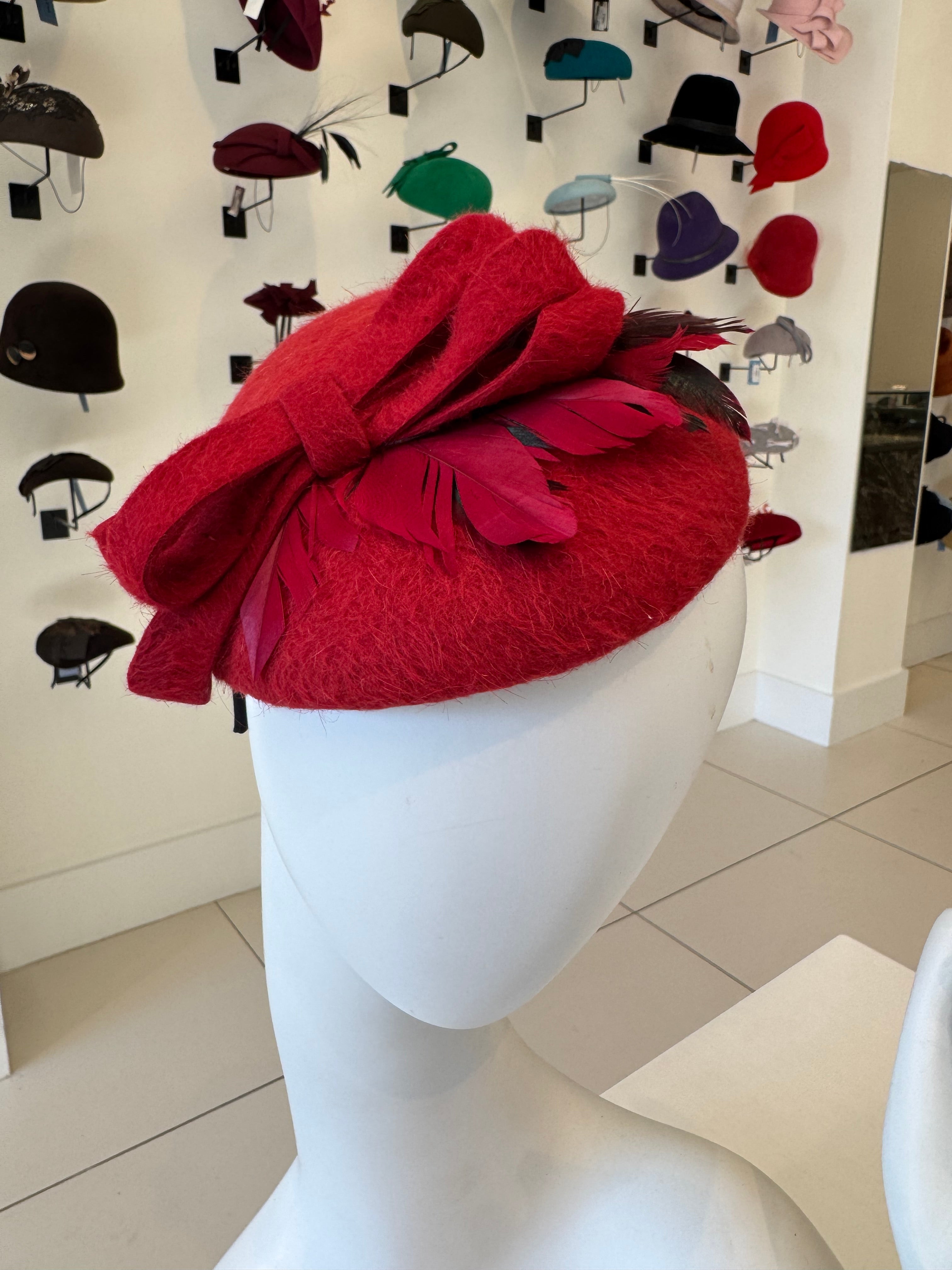 Red Velour Beret With Bow & Feather Trim