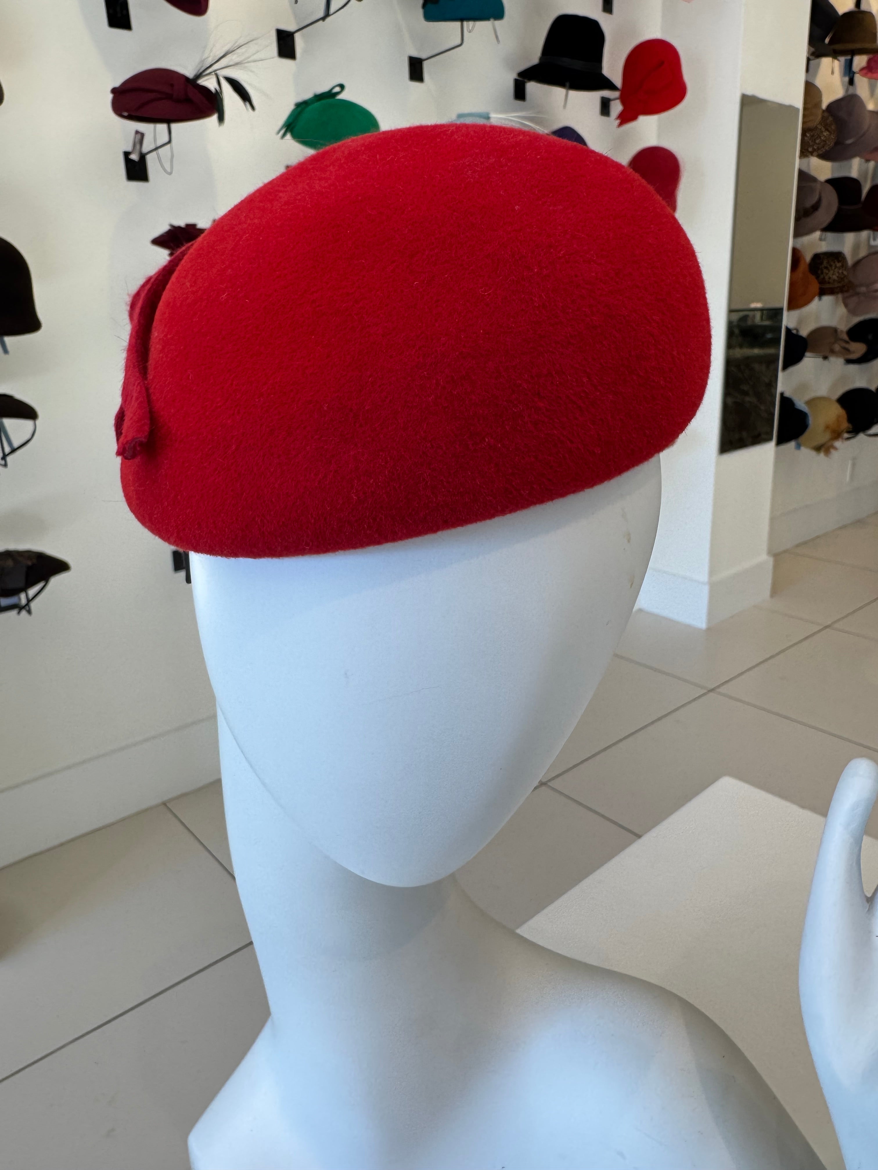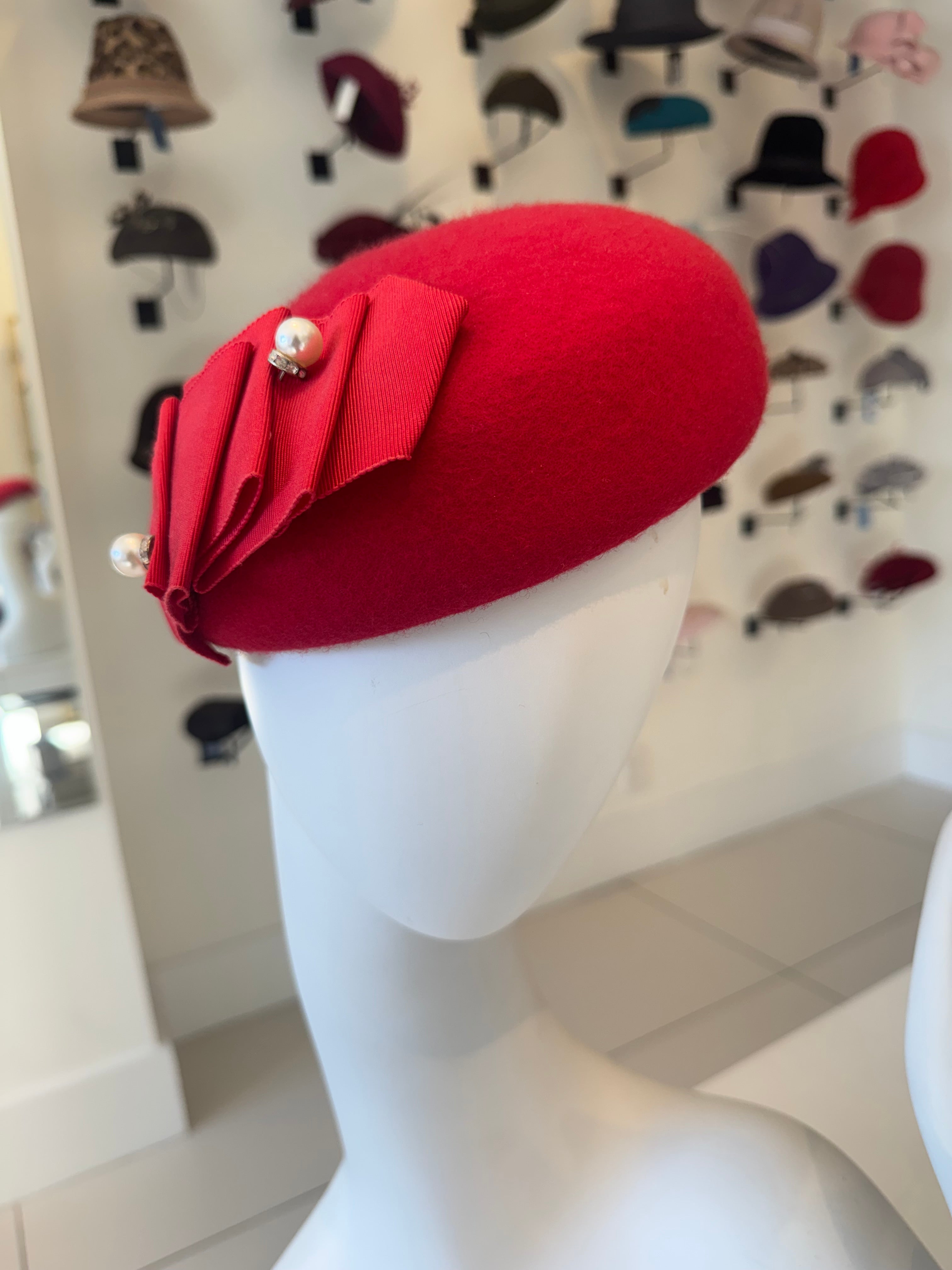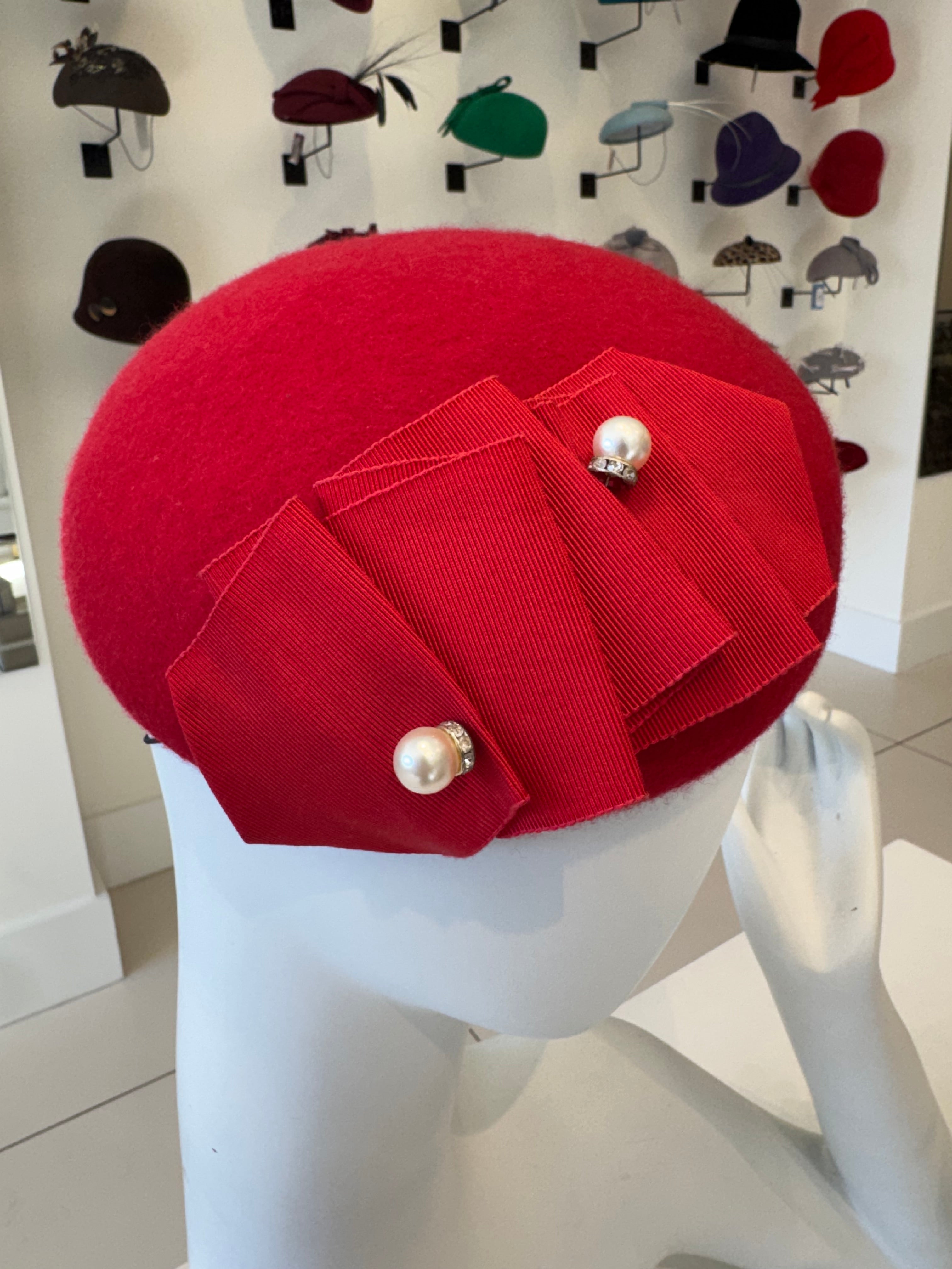 Red Beret With Pleated Grosgrain Trim & Pearl Detail