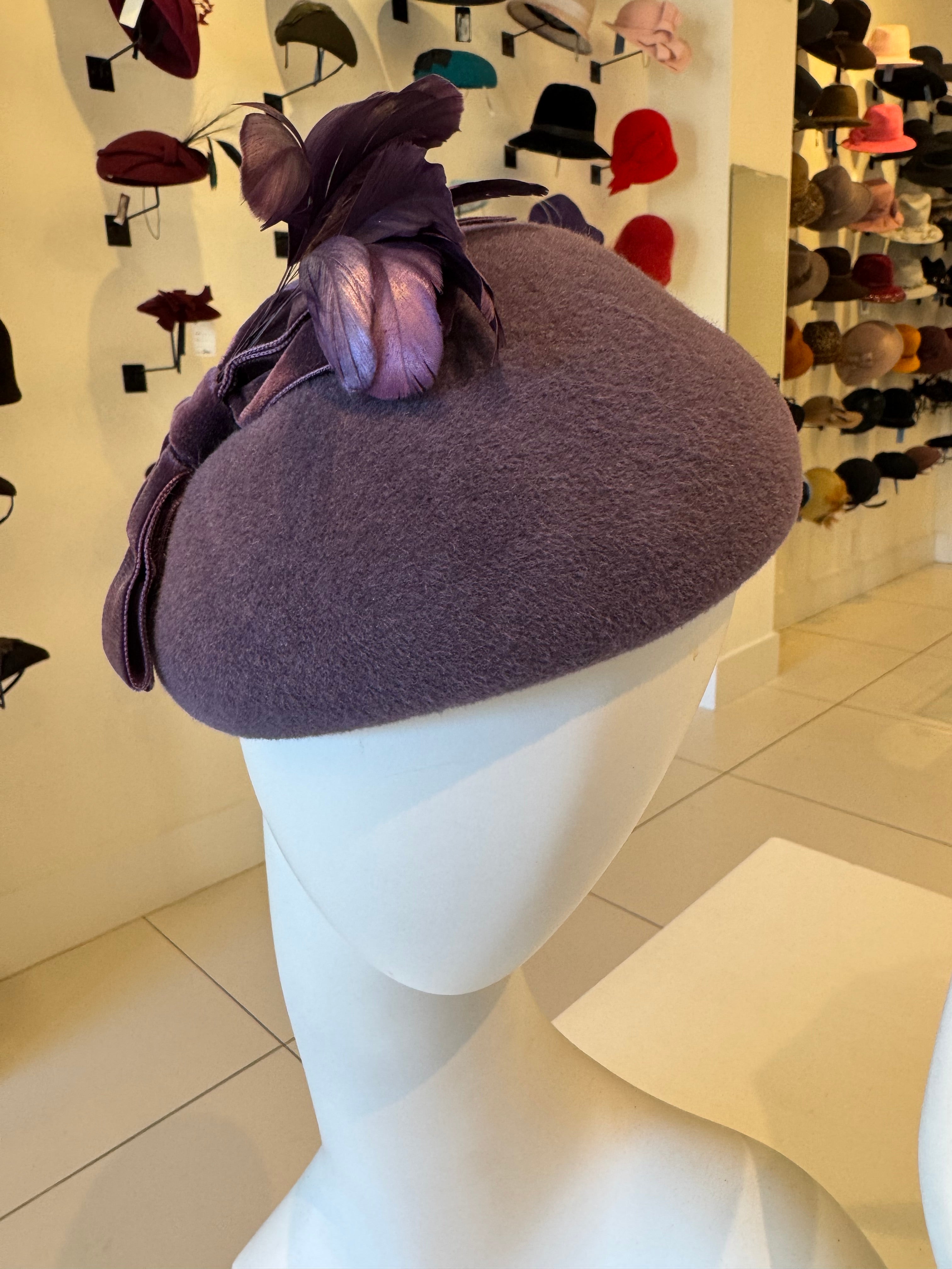 Purple Velour Beret With Bow & Feather Trim