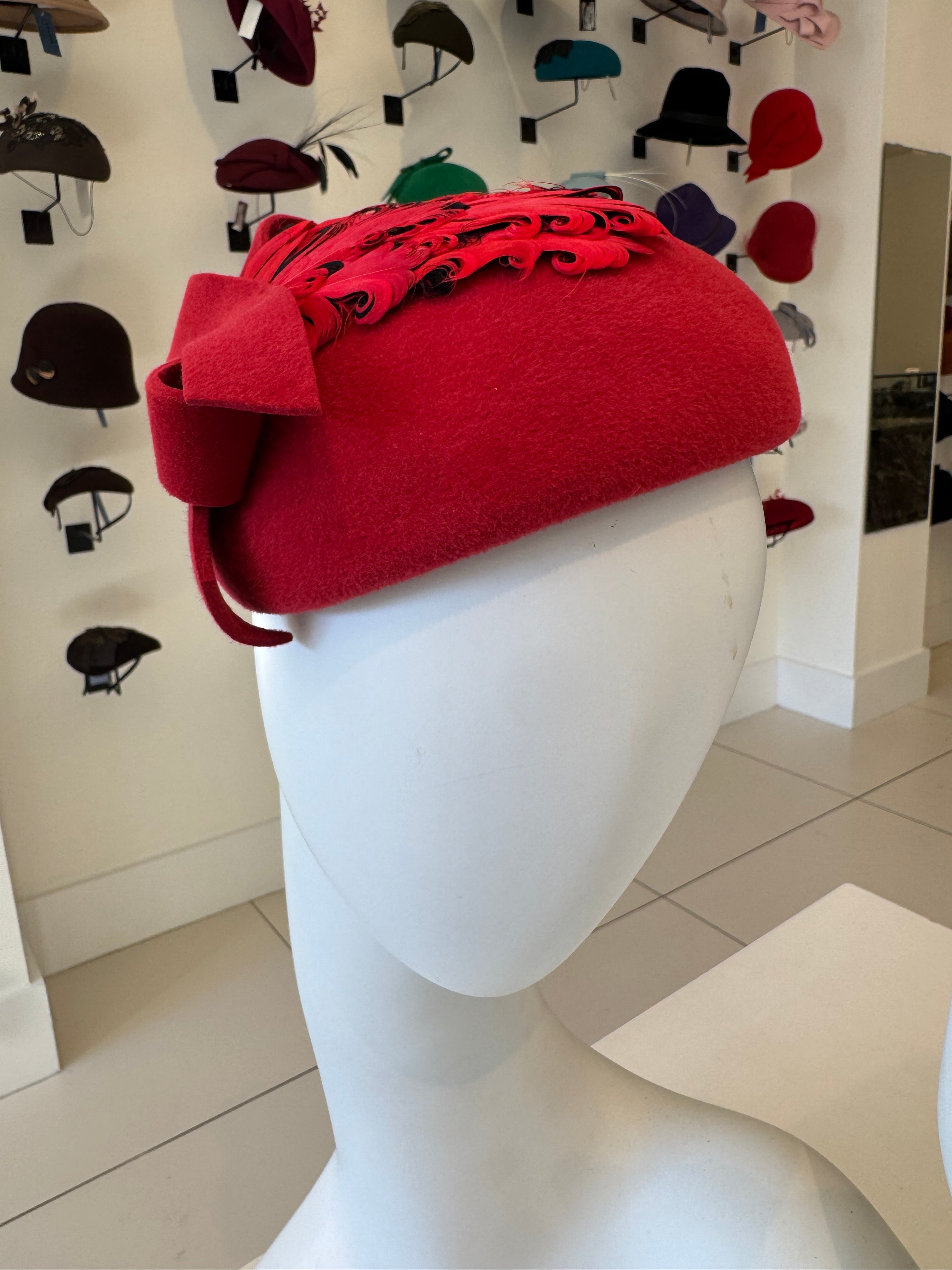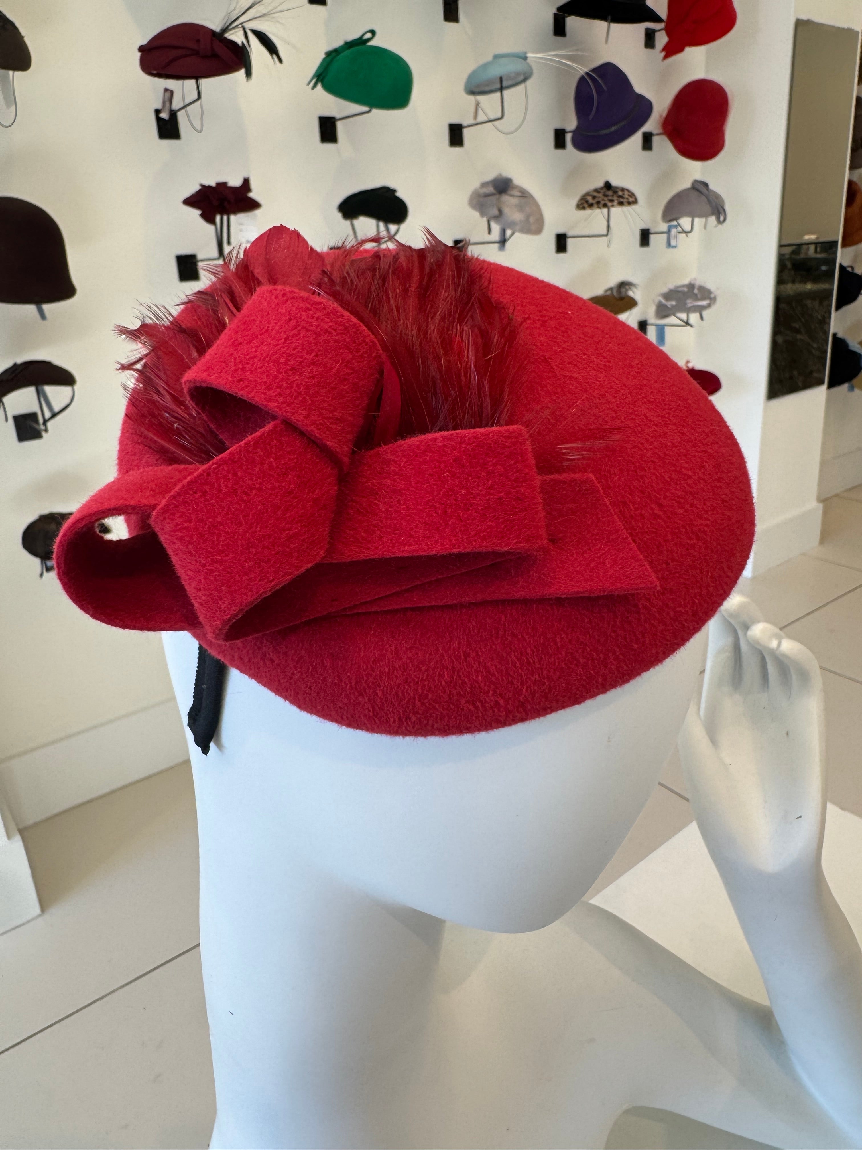 Red Velour Fascinator With Bow & Feather Trim