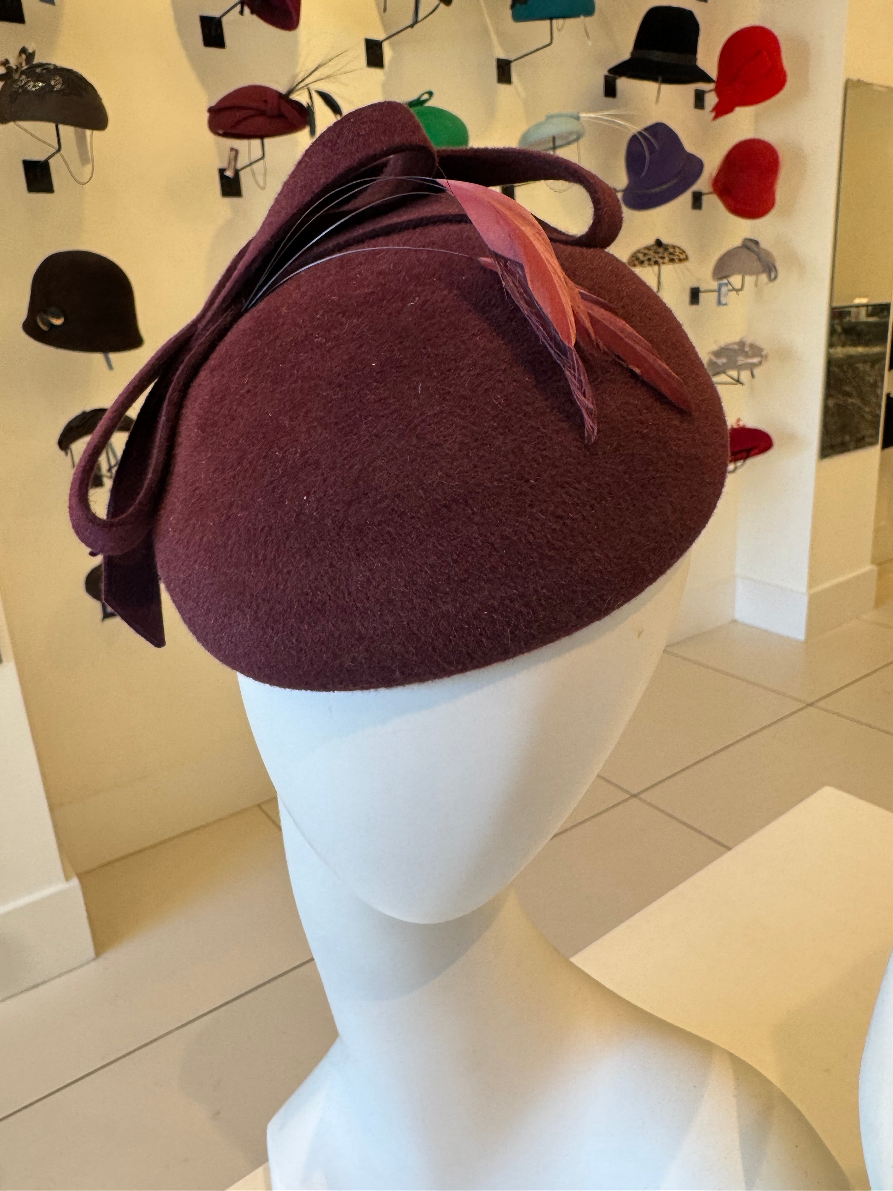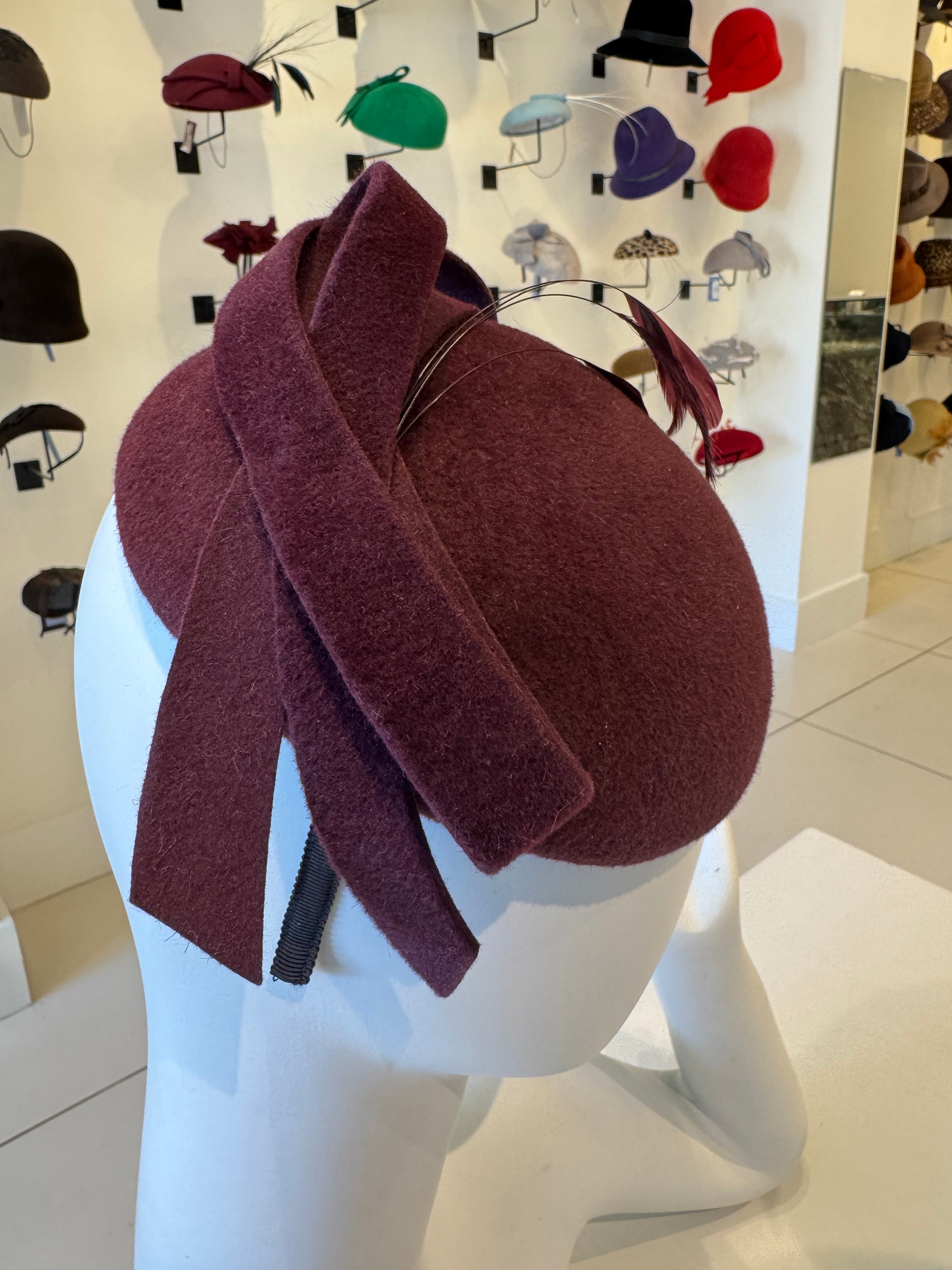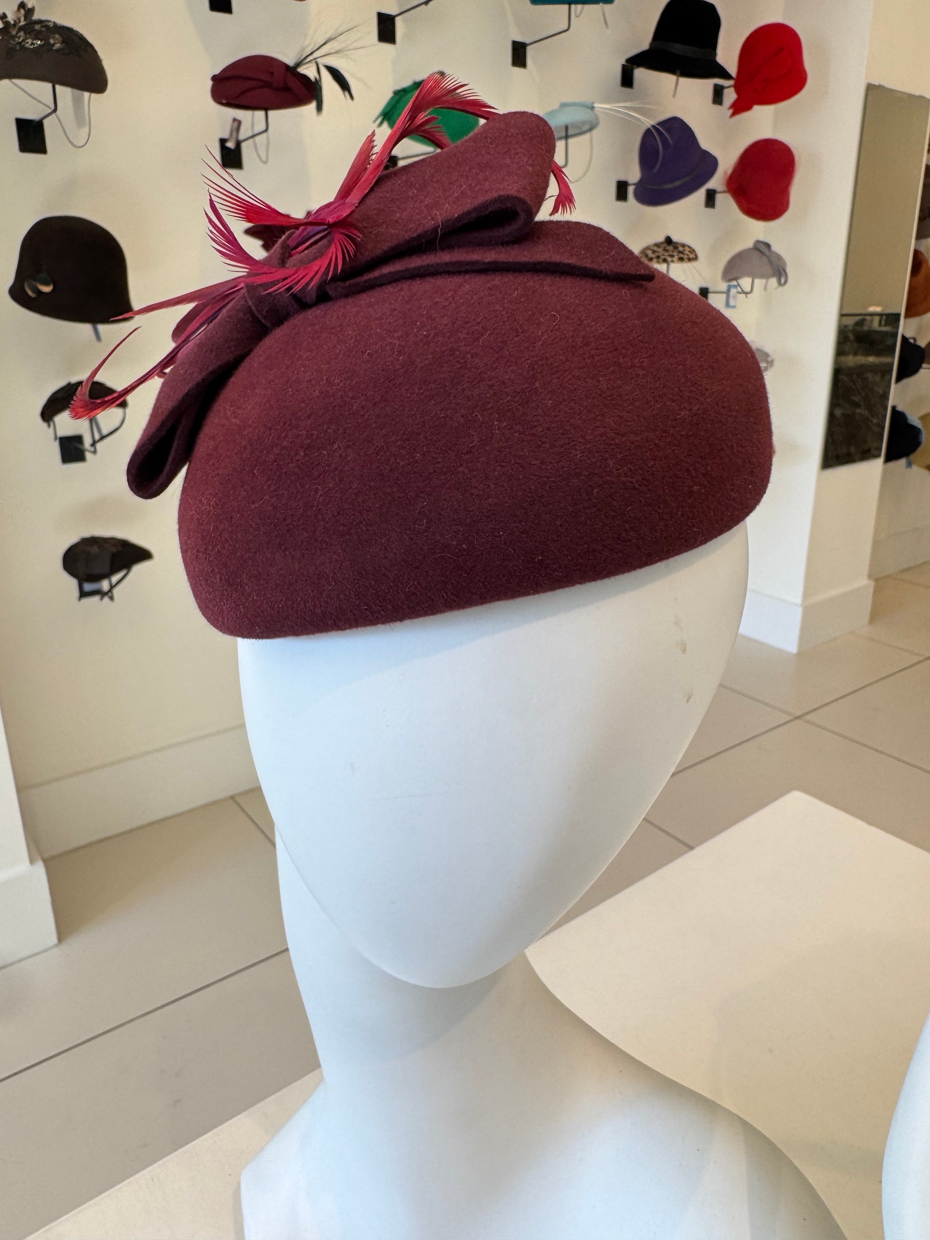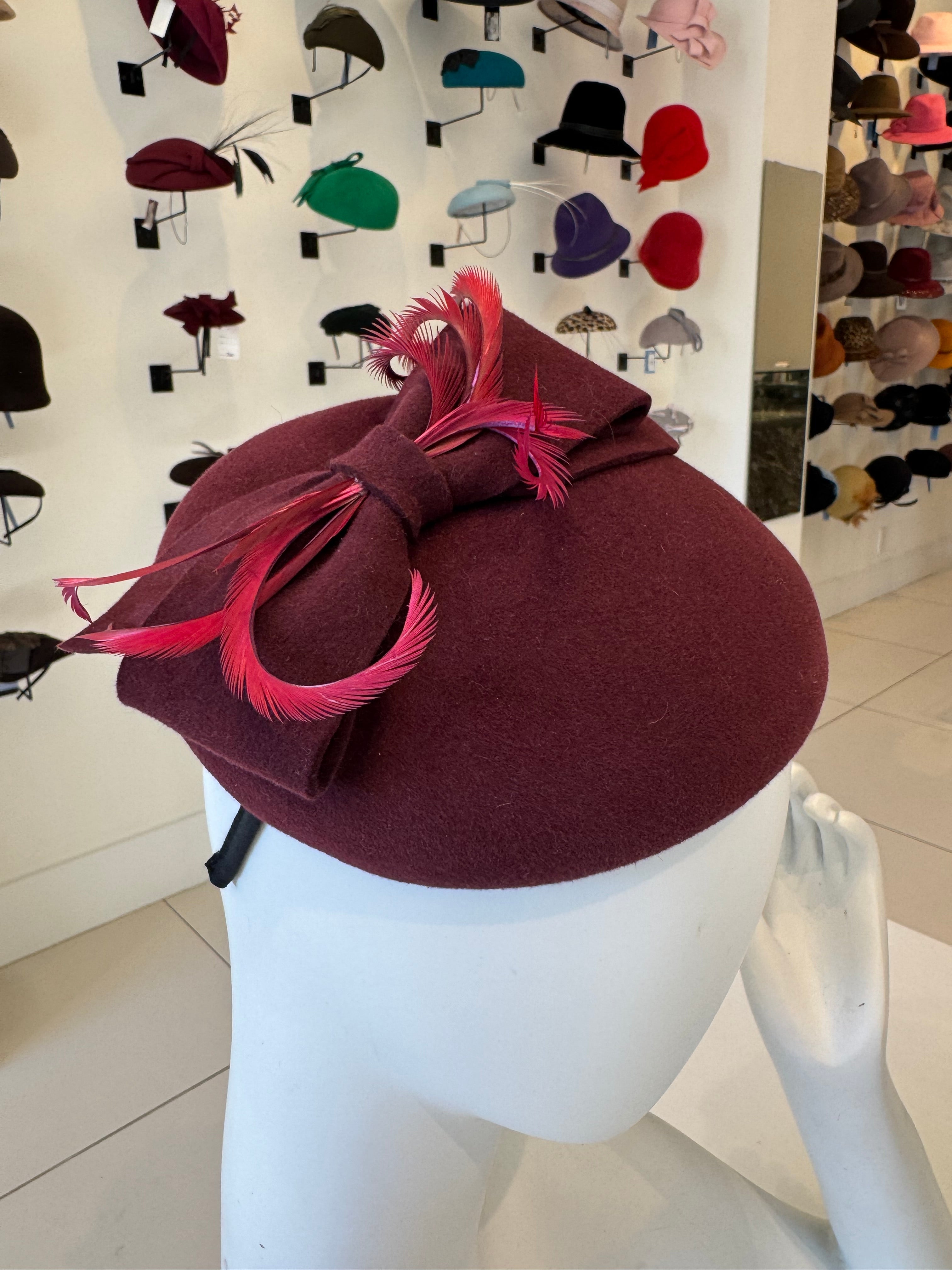 Deep Burgundy Velour Fascinator with Bow & Feather Trim