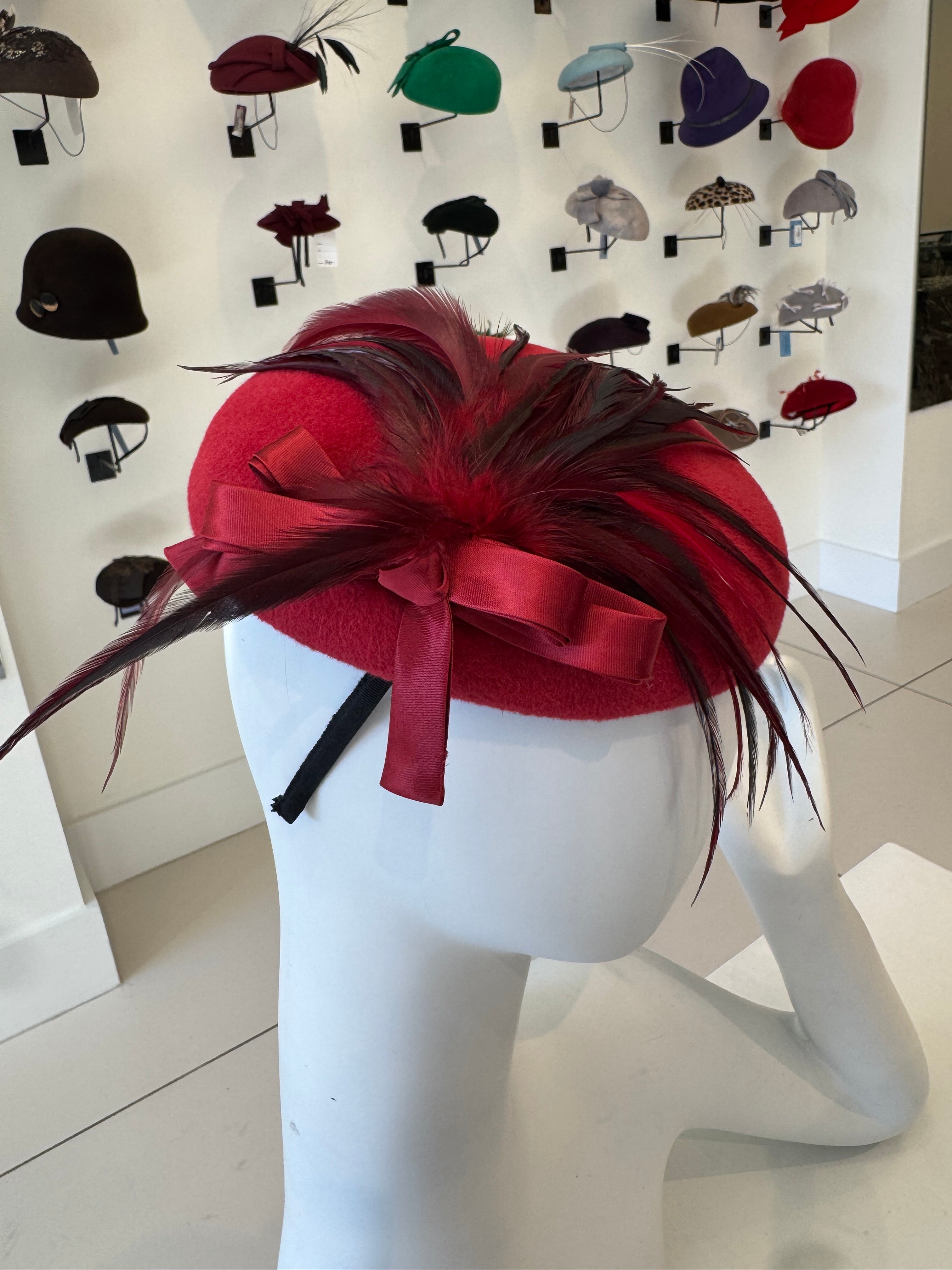 Red Velour Fascinator With Ribbon & Feather Trim