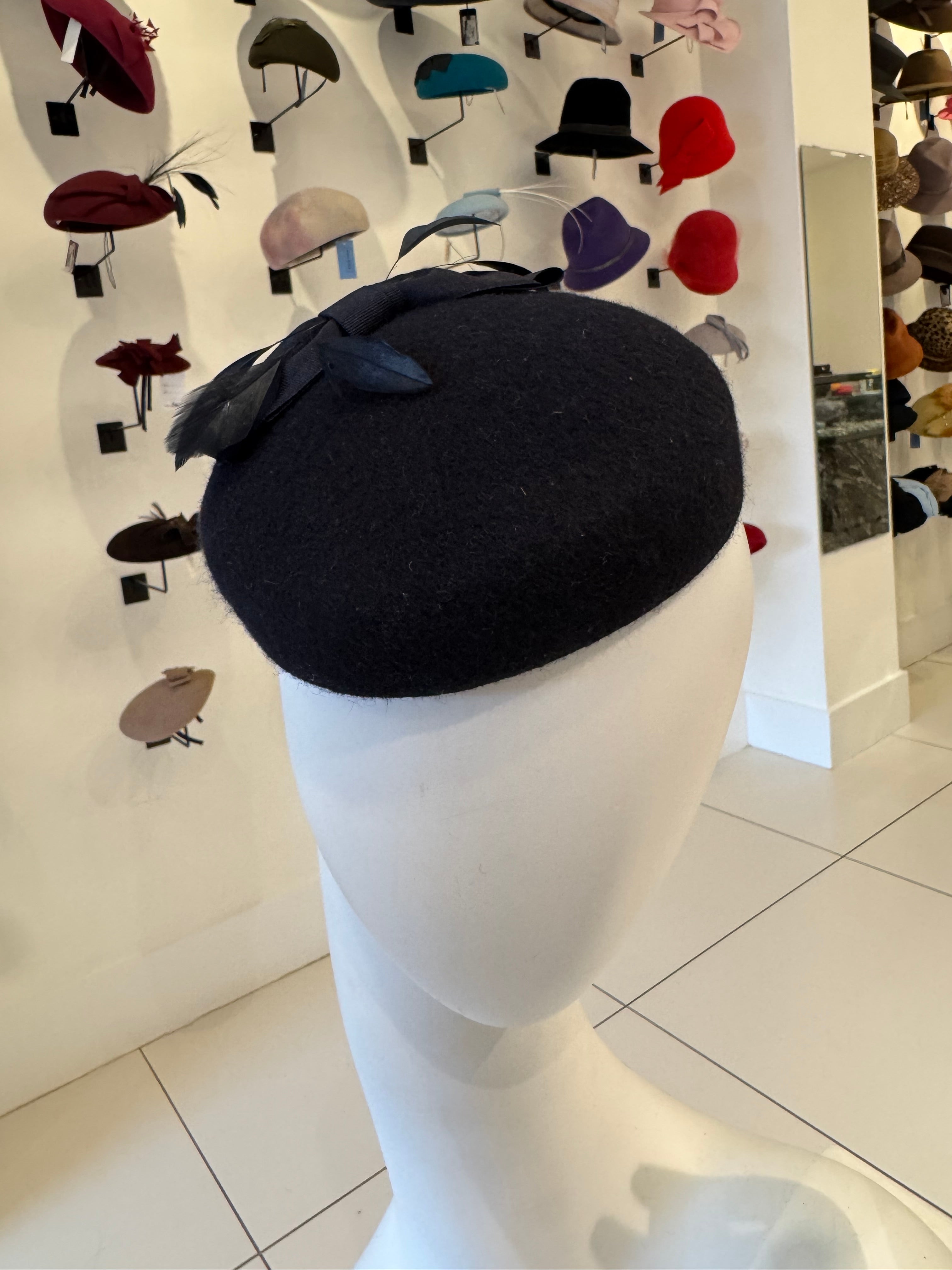 Navy Blue Velour Fascinator with Bow & Feather Trim