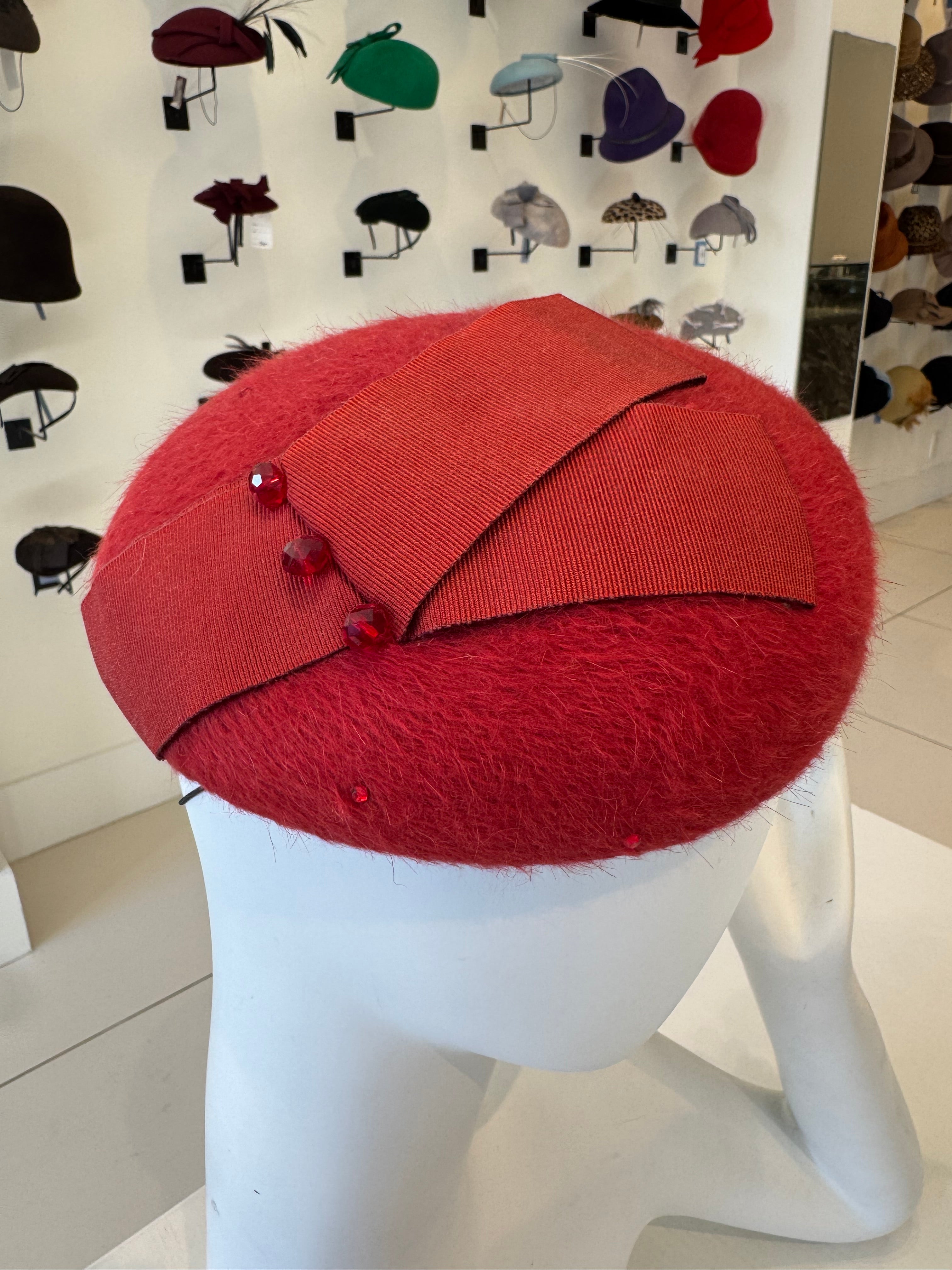 Red Beaver Fur Beret With Ribbon and Crystal Detail