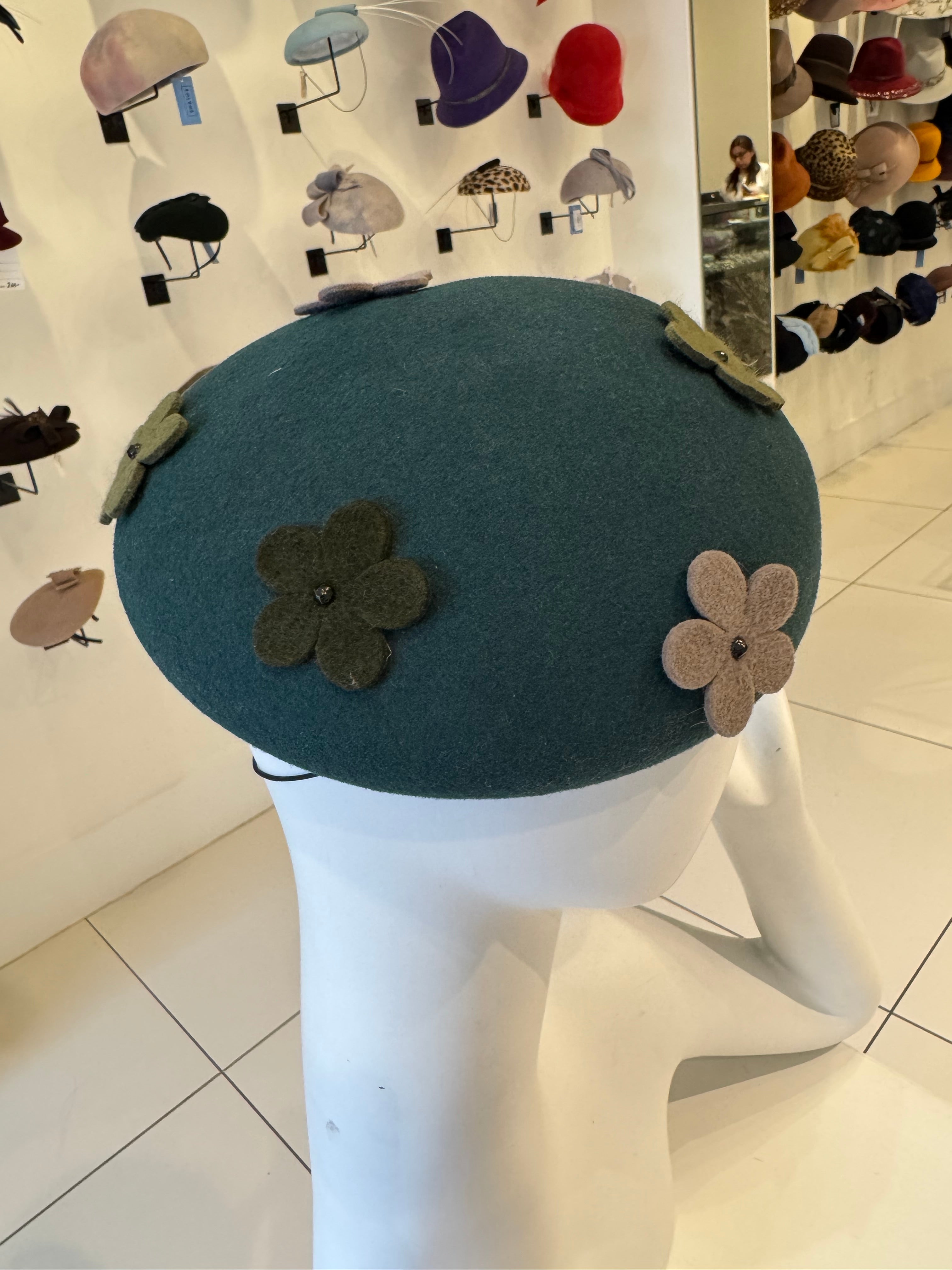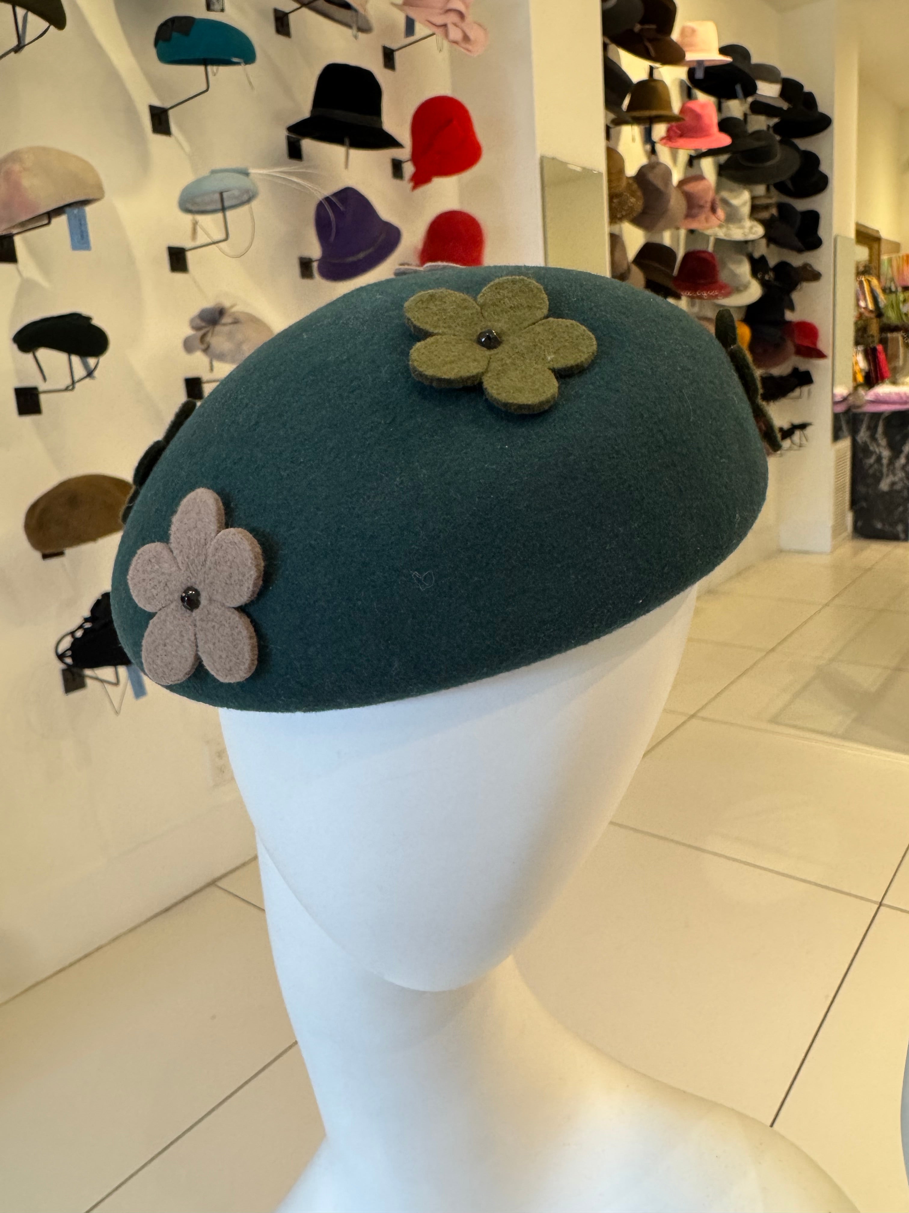 Green Wool Felt Beret With Multi Color Flowers