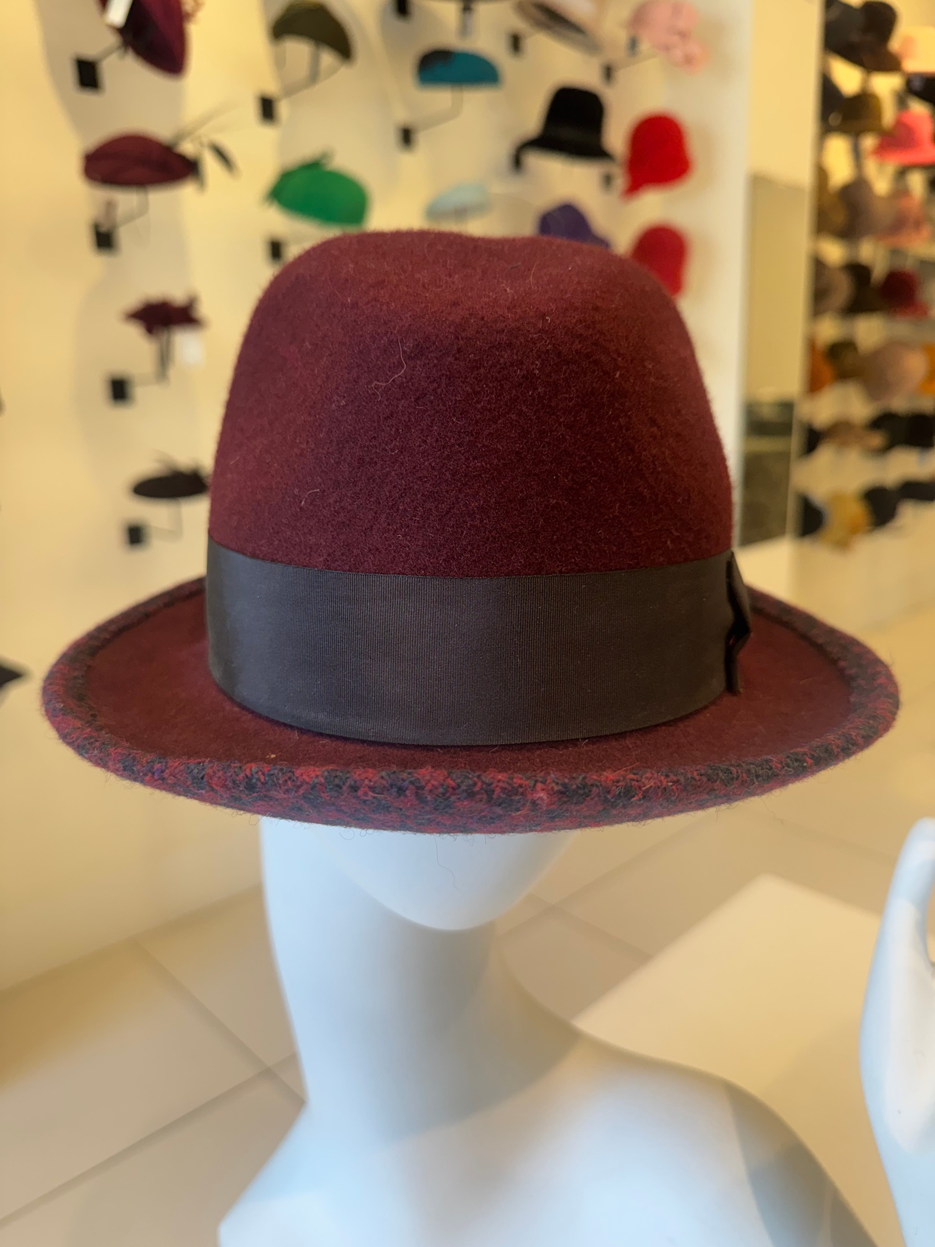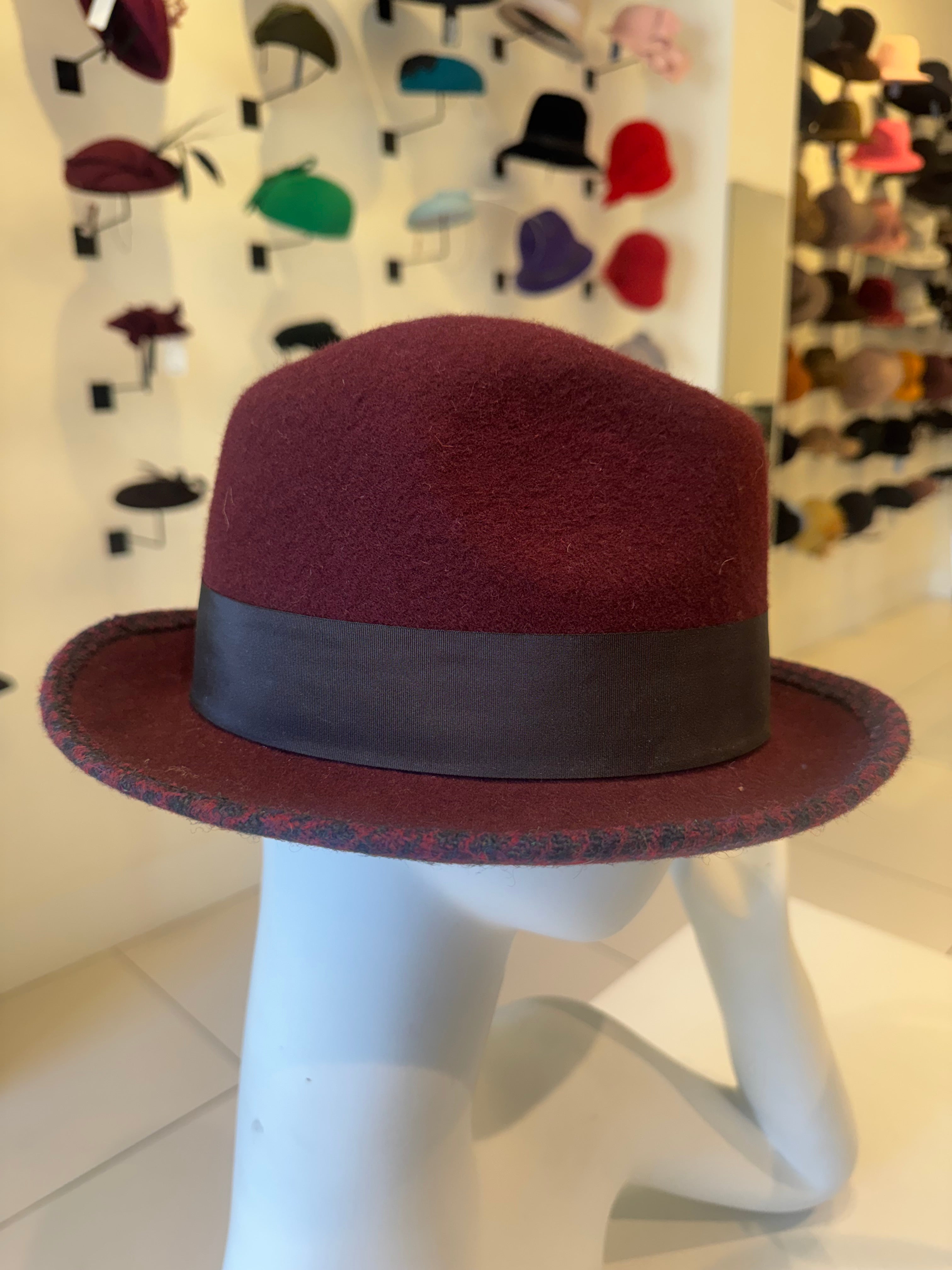 Maroon & Gingham Wool Fedora with Ribbon Trim