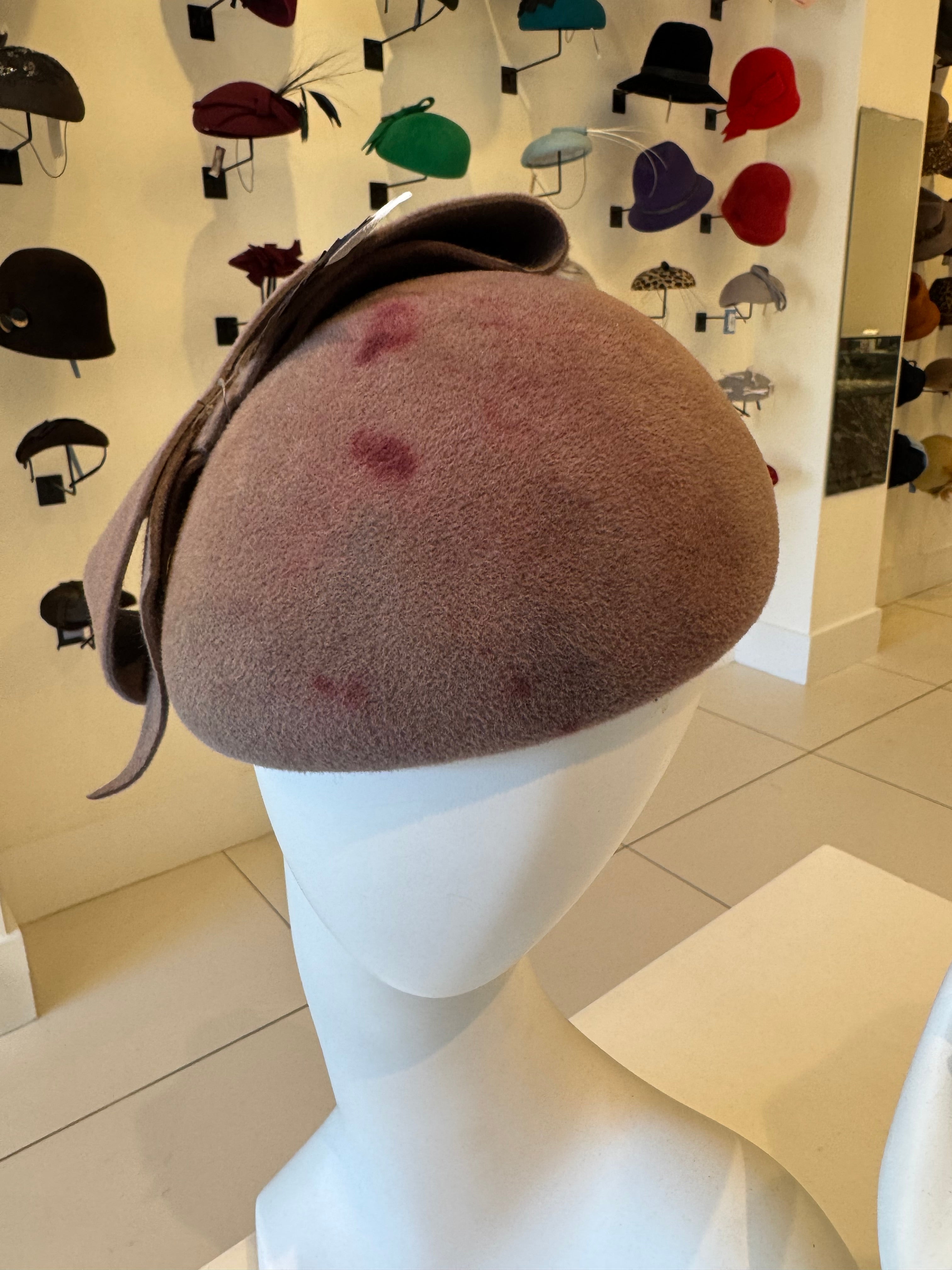 Taupe Dyed Velour Fascinator with Bow & Feather Trim